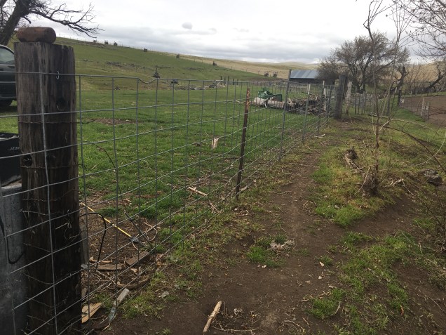 I came home early on Friday just so I could work on the Gizmo fence. He has learned the many splendors of the snack potential in the barn and surrounding area. As soon as we let them out to potty he is running for the fence and squirts through the 4×4 hole. Once he is out of the yard he will not come back. It does not matter if you can see him and call him. He pretends he doesn’t hear you hollering “I can see you!”. So I will be installing a 2′ chicken wire fence using hog wire clips. It was cold, windy and rainy that afternoon. I used 1500 clips before I got cold. I only have a few hundred clips left and will have to order a few thousand more to finish the job.