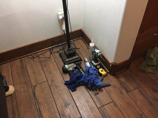 Mr Experience and I worked on floor trim on Thursday. We decided on a 45 degree angle on the quarter round as I did not want to catch my pinky toe on the edge of the trim. Annmarie thinks its for cosmetic reasons.