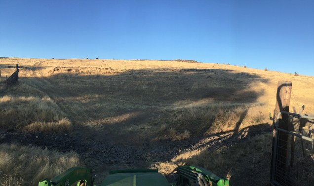 Yet as the mistress took me up the hill i noticed what looked like a well beaten path going up to the top of the hillside. I knew i had only been up there a couple of times and could not have made that many tracks . I was right, Bubba decided that the extremely large pile of rocks on top were a lot less work. The rocks are all loose and you can just drive to one spot and load them up. Now this might upset the rock chucks that live in the pile but other than that no harm. If you look at the below picture the old rock fence is at the top of the shadow and the huge pile of rocks is at the skyline. Oh well, the grass truly is greener on the other side!