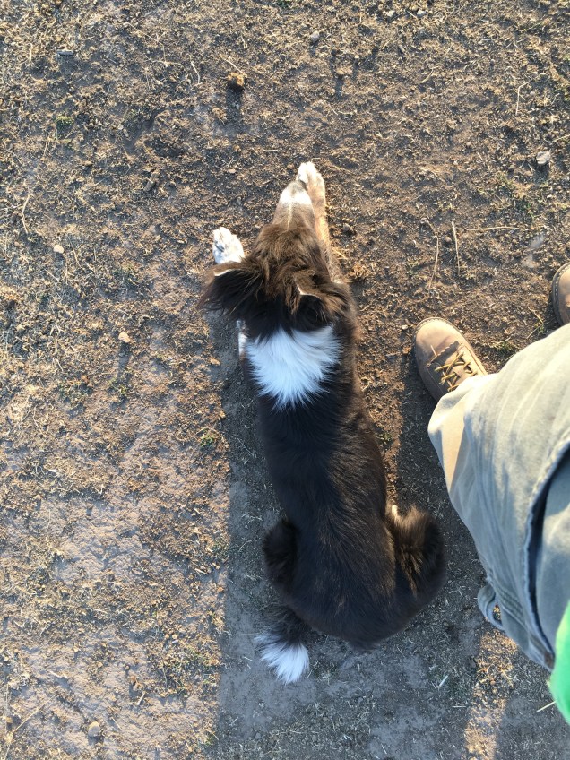 Mouse was being a good boy and listening. We were waiting for Annmarie to push the sheep past us. We were in place to keep them from circling around the barn lot instead of going out the gate and out onto the upper hillside. Once the sheep spotted Mouse they turned and went out the gate, without him they would have just ran right by me.
