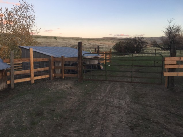 There is no power out near the lamb shed so I used my battery operated sawzall to cut the lumber. I ran out of heavy wood anchor bolts and I still need about 10 more. I have four more boards to install and three more panels to remove before the corral is done. I am going to have to order some more online. Through Amazon they are about 40% cheaper than I can get locally. I just have to plan better so that I have them on hand before I actually need them. I had to finish cleaning out the corral and remove all the panels I had laying around. I found enough to go across one side of the barn lot. I have to install one more gate in my quick fence and we will have an area blocked off for the cows and horses. It’s not sheep proof yet and I think I really need to install a fence with three more rock cribs to hold everything in place. Maybe next year, or the year after that if I get time. You can kind of see it below with the opening on the left side of the picture.