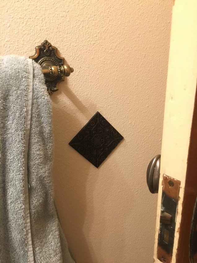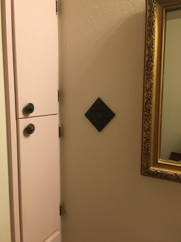 I sprayed our door stops with clear coat today and installed both of our bathroom ones. They keep the door knobs from hitting the walls and making dents. Annmarie put screw holes in them so I don’t have to glue them onto the wall anymore. Now we can take them down if needed.