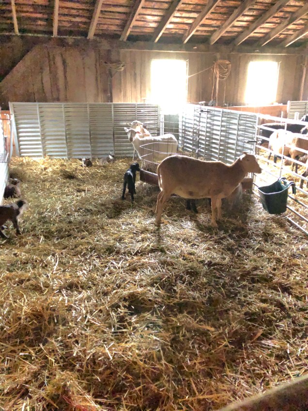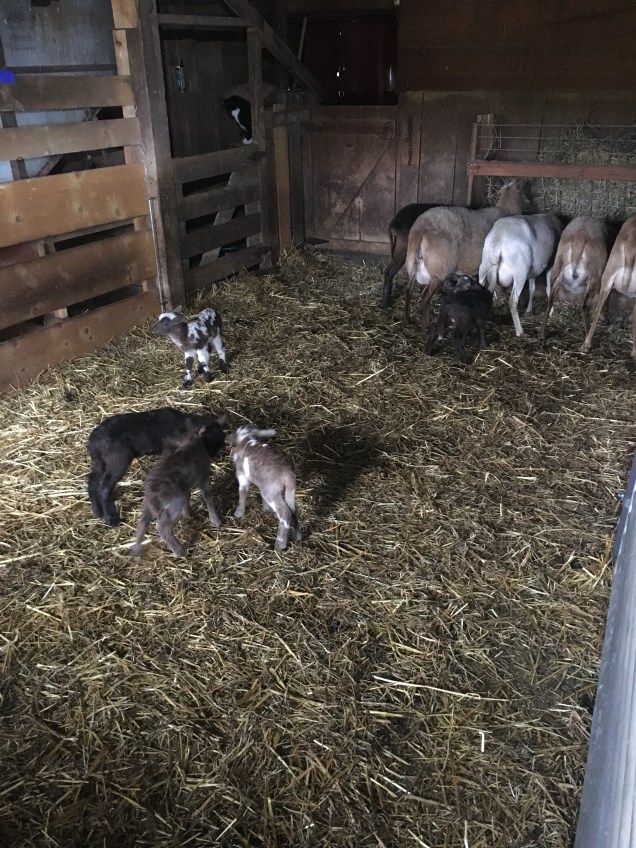 In a couple more days we will start letting the older babies go outside with their mommas into our limited outside newborn enclosure. This is our set of triplets. All the babies but three are solid chocolate brown. Three of them are spotted white and brown and very cute. One of those is a girl as I checked while getting lamb snuggles today. We may keep her. Her mother is super relaxed and calm which is what we are looking for in a breeder ewe.