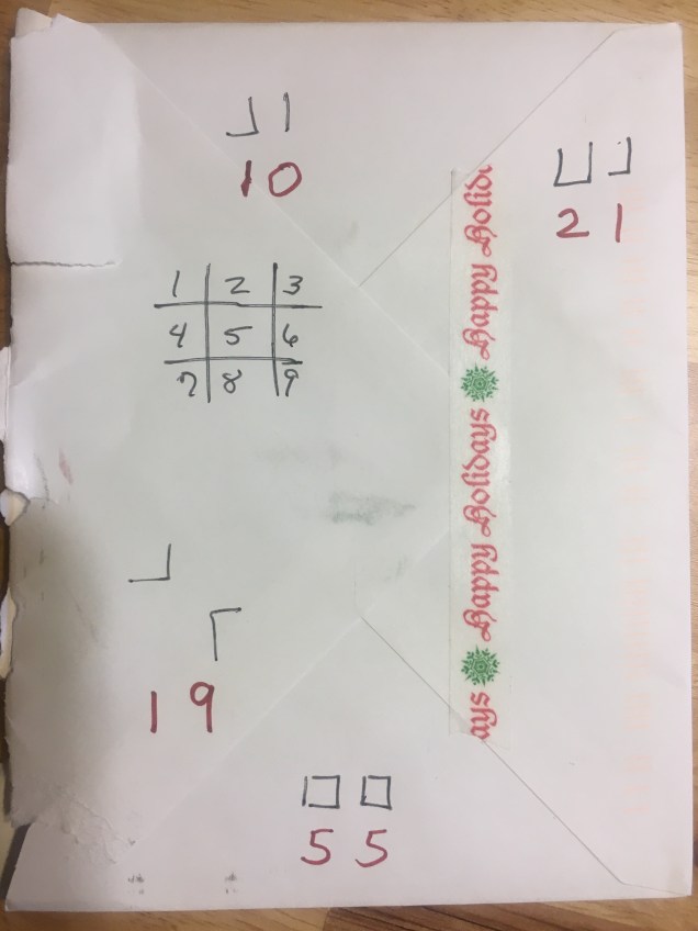 This morning she talked to me about marking the babies and mother sheep when we start lambing. We tried a crayon marker a few years ago and did not have very good luck. Instead of using paint irons where you have to use multiple irons her family uses a L shaped iron and marker paint. She drew it all out on a old envelope to teach me. You create a grid of 9 numbers and use the L iron to create the sides of the grid around the number you want.