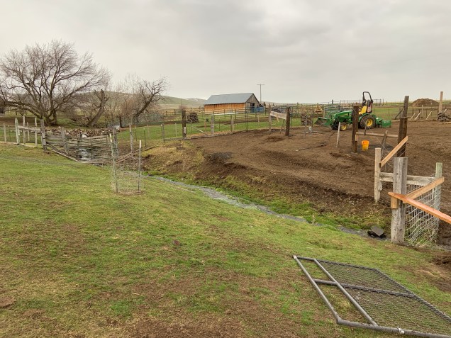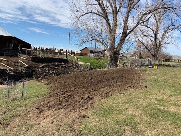 I again fell into the water. I slipped on the muddy hillside and landed flat on my backside into the water filling my waterproof boots. We got all the rocks I had brought down near the water’s edge when Sarah came and told me it was 1815 and time for dinner. I had left my watch and cell phone in the house at lunch so I had no clue what time of day it was. It was quitting time anyways, Tex had rolled his second from last rock into the water and the two of us could not lift it up into place and could barely roll it into place. The rock was only about 150#. Earlier we had been moving several hundred pound rocks into place. Tomorrow I will get more large rocks and we will start putting up wire fencing. I would like to get flower seed on the ground.