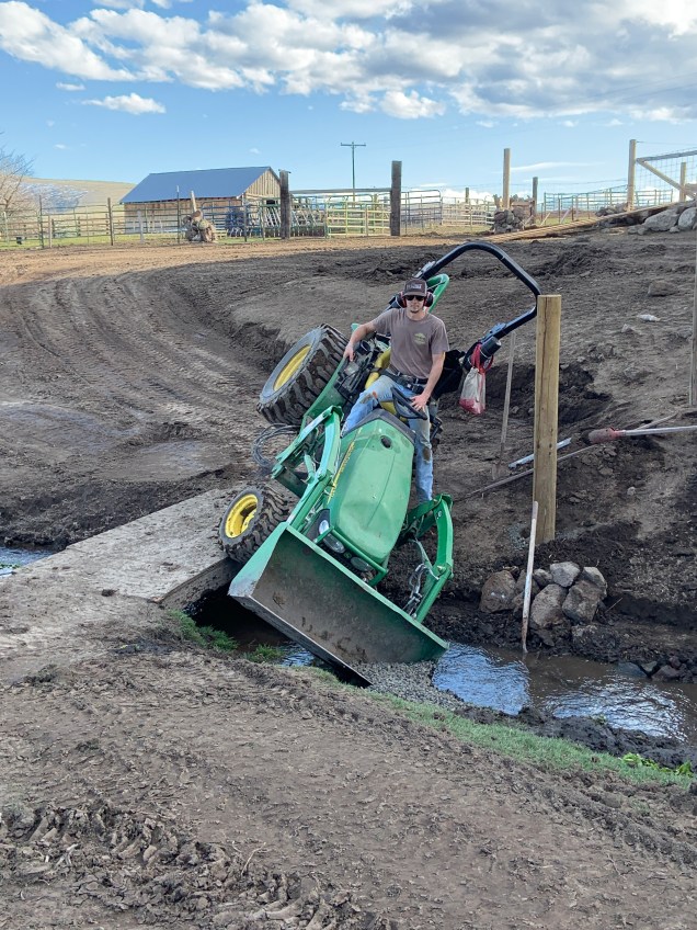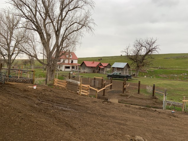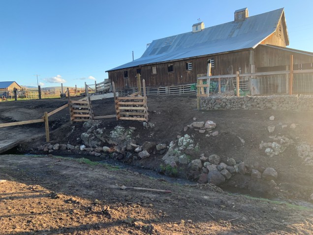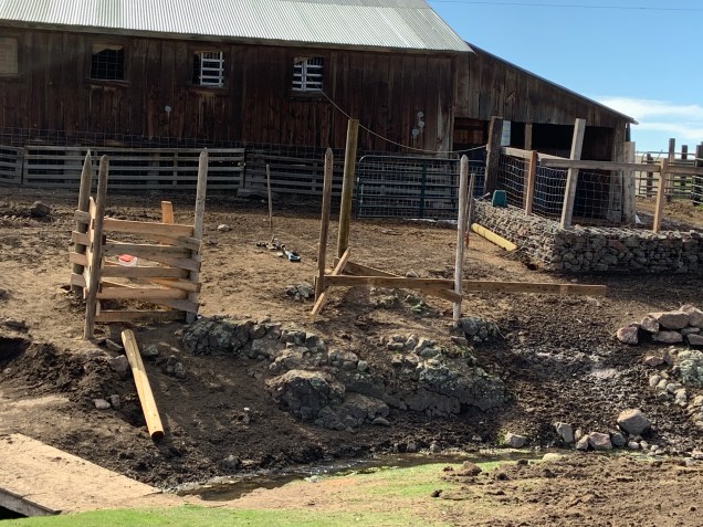 We got all the rock cribs filled, I put about 12 rocks in only, Tex did the rest. We then started to wrestle with the large rocks and tried to get them on a shelf down by the water. This was not easy and especially not easy after they roll down a muddy hillside and go into the front spring. Muddy wet rocks are not easy to move around. Tex managed to get most of his rocks into the creek.