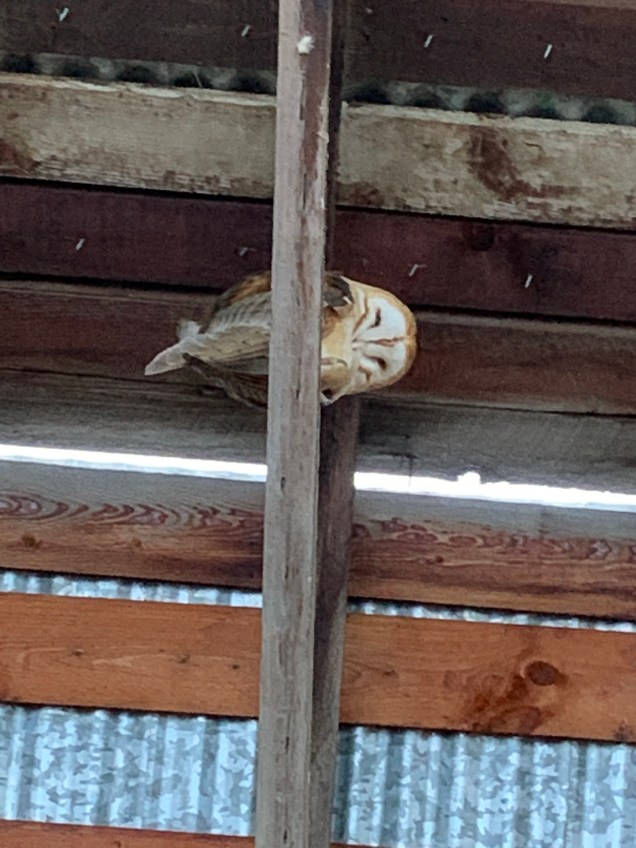 The barn owl is hanging out in the machine shed now. I went out to feed the cows and it just was not going to leave. I started up the tractor and it just peered down at me and gave me the “what for” look. I drove off and it never moved from its perch.