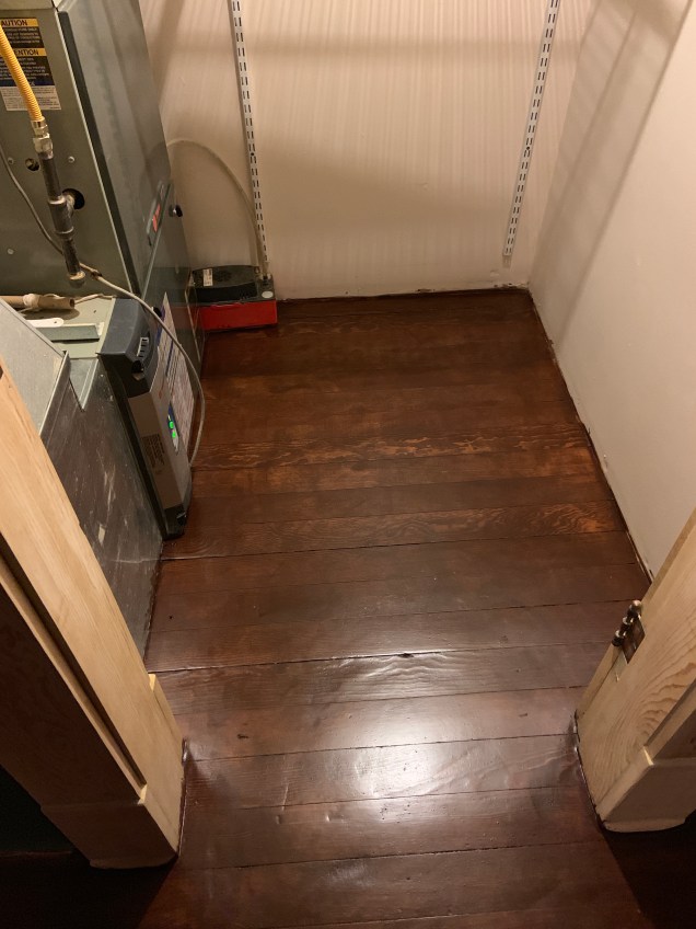 Well it took a week longer than I thought and Annmarie had to sleep at her mother’s house for an extra week but I got the stairs and spare room floor finished. There is still a little light spot on the stairs from the dogs going up and down the stairs but it is not super noticeable. I suspect I will have to do the stairs again in 10 years. I may even sand them smooth then. I just slopped stain over them as is until I was happy with the color then slopped Varethane over that. I may have a few dog hairs in the Varethane.