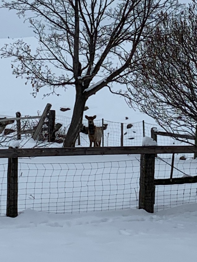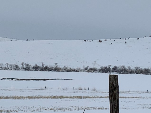 Mother Nature finally drove the elk out of the mountains last week. There is so much snow up there that the elk cannot dig their way down to fodder. When this happens they move to lower elevations which means wheat fields, hay patches and CRP. The real problem with this is the elk are very destructive. Not only do they just tear down fences by going through them but they dig up the ground looking for food. We have about 80-100 animals on our property.