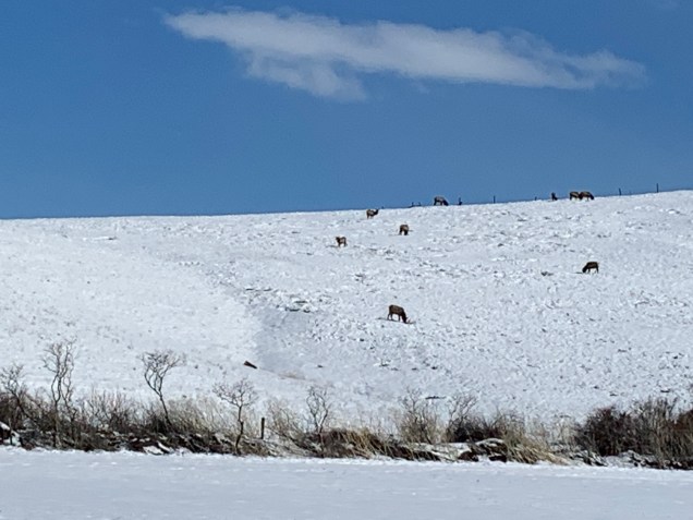 The sun was shining today and melting snow despite the temperature only being 30 F. The elk are still on the back hillside. We have mostly cow elk with the occasional bull, there are larger bull elk in other fields, just not ours.