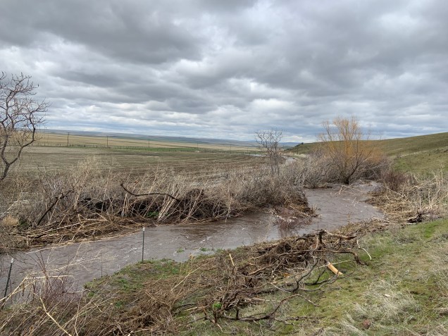 The water was pouring over the dike wall into the field causing many problems. The main problem was we could not just go to the problem area. This section of creek has a concrete weir poured into the banks and its the narrowest spot. I was sure the water was damned up behind it. I was right. We climbed it onto the flotsam and started to pull branches and thistles out of it and toss them onto the bank. The water is definitely runoff from the snowmelt as it was very cold. We cleared the first jam and moved up the creek.