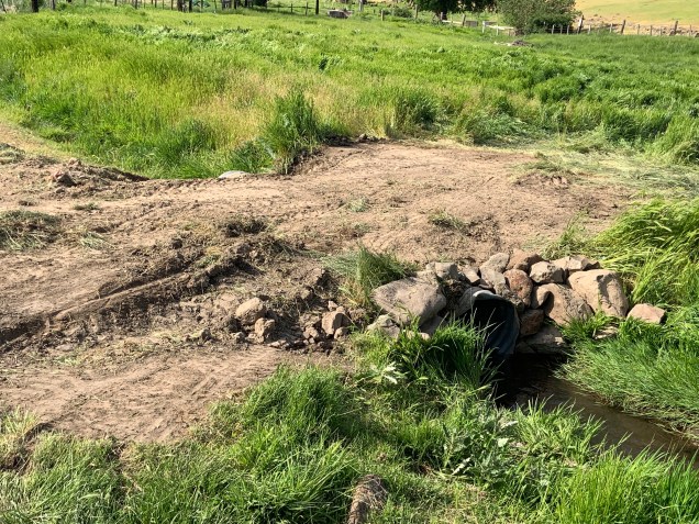 Afterwards we went to install the culvert in the orchard. We had to dig out the bottom of the channel by hand and had to put it in a couple of times to fit test it prior to back filling it in. I was able to use the old dirt and then drag down the edges. We even rocked in the inlet side of the culvert. I can now get the tractor over to the other side of the ditch.
