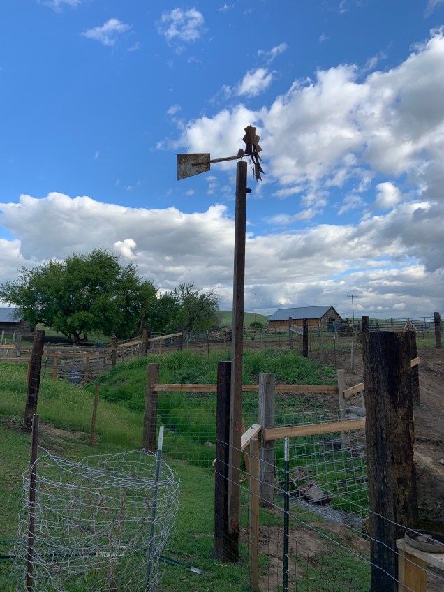 that used to be bolted to a post that had old ceramic insulators installed at the top. The barn and old lamb shed used to have knob and tube power. I pulled the old copper wire out of the spring a few years ago. I had taken down the post as it had rotted away and saved this 4×4. I was going to mount a bat house to it at one point but while cleaning out the machine shed I found an old decorative windmill. I washed it all down with some water and applied some fresh grease. I had the metal sleeve also so I was able to drill a hole in the end of the wood, which turned out to be a solid piece of cedar!!! This would explain why it did so well laying on the ground for the last four years. I greased up the metal sleeve and after installing the windmill it just sat there and didn’t move. A couple of hours later the wind picked up enough to break everything loose and the windmill started to spin and it pivoted on its wood post. I was able to use some of the old lag bolts I picked up all over the farm. I found a railroad tie that was level and had not been pulled over during fence construction. I love it. Once Annmarie spotted it moving around she was surprised at how well it fit. Another fine example of a repurposed item. I finished it just before a rainstorm hit.