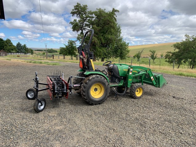 It had rained the days before so we did not want to cut any new hay. Instead we planned on turning hay. I had a funeral to go to so we got Tex all set up with our new 5 foot power rake. He will turn all the hay this Saturday. This rake will let you pile it all up into a row. I had visions of Tex just following the rows that the mower created. he did one better! He went down one side of the row then at the end of the row he turned around 180 degrees and went the opposite direction allowing the row to double in size and cut the number of rows in half. This was very clever and not something I would have thought of had I done the turning.