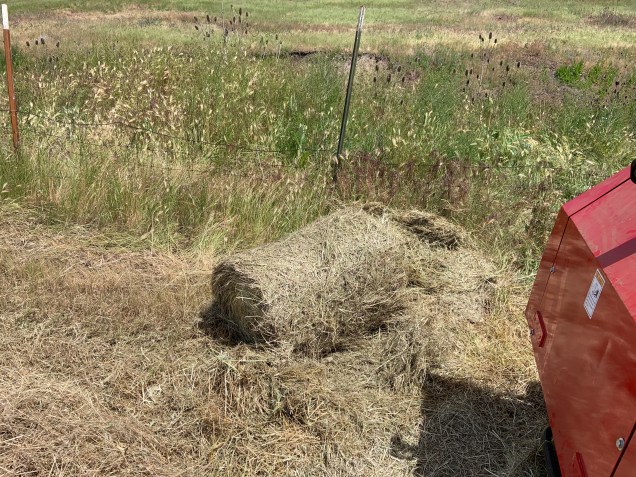 Tex went with me as we figured there would be a learning curve. This was a major misstatement as we managed to only make two bales in the first hour and could not get either one of them wrapped in twine. They were totally naked. We managed to shear off two shear bolts and discover that a pair of spring wire pliers are needed to correct this issue. I do not own a pair of said pliers so I did it by hand, which is never fun. I finally got three bales done correctly and Tex went off to work on the machine shed while I tried to figure it out.