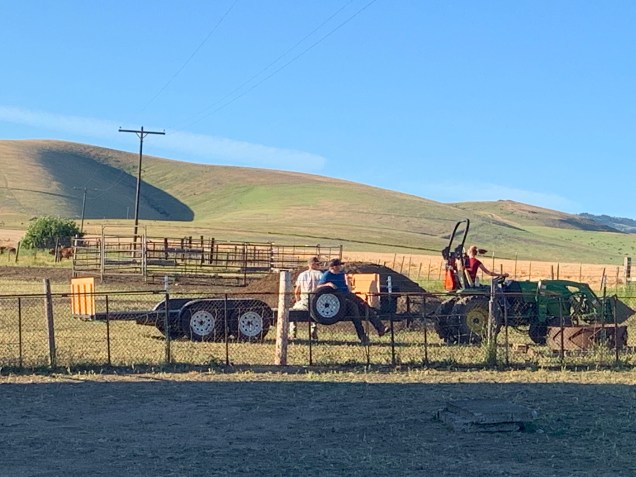I then spent 7 minutes teaching Slim how to drive the tractor, the most important part being always wear your seat belt. I figured she had never pulled a trailer before but going slow and her brother, Tex could give her pointers. Tex and Hoss jumped on the trailer, I went to work and hopefully the hay gets put into the barn magically.
