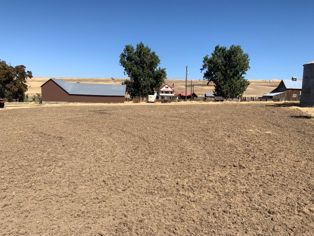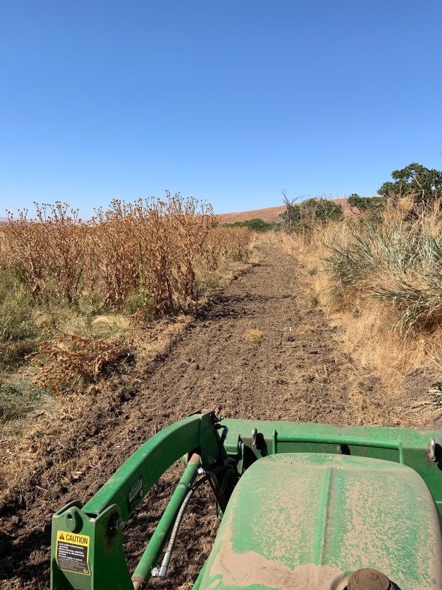 I made fresh fried potatoes with onions, a touch of jalapeño and bacon grease for breakfast. It was very good, after I dished out Annmarie’s portion I added bratwurst to mine and fried it all together. The brats were left over from a couple of days ago and already cooked. I knew I was going to get on the tractor and stay all day. I drug a path next to the wheat field back and forth with the disc. Mind you its only four feet wide and it takes a few passes to notice anything when there is that much vegetation on the ground and it is this dry. I spent all morning doing that and getting the last 7 acre field at the far end of the property. All the fields have bare spots around them and a second bare patch next to the wheat field. I even came up behind the machine shed and disced about an acre of ground. I picked up an entire tractor bucket of wood, metal, rocks and twine as I broke the ground apart. There was a lot of hidden stuff out there.
