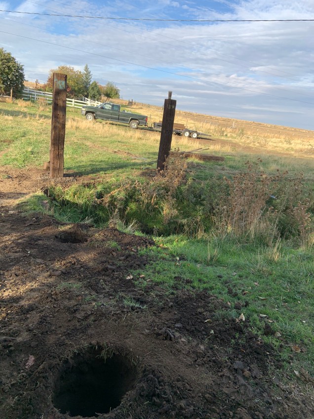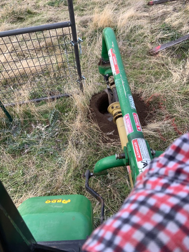 I had to use the tractor to pull the post out of the ground and then had cut the hole four more inches. The ground is still pretty dang hard and dry despite the green everywhere.