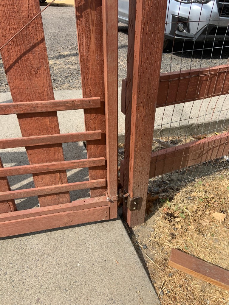 See there is a floor underneath all of that straw and manure, it just takes some effort to get there. On Monday (4/42), I decided to finally fix the front gate. It can no longer latch as the pressure treated 4×4 has decided to crack open right where the hinges are located causing the hinges bolts to sag. This has been a problem for about two months and since I now have a welder Annmarie has decided that there is very little that cannot be fixed on the farm. Unbeknownst to Annmarie I need some metal to make things and I need some small indoor storage space for metal. I have started to collect all the dug up scrap I am finding and keeping it in one place so I can dig through the scraps and find usable pieces. I dug a piece of angle iron out of the ground and drilled three holes and ground it off and ground in a V-shape to stabilize the bottom hinge bolt and then bolted it in place. Our front gate now actually swings and latches again.