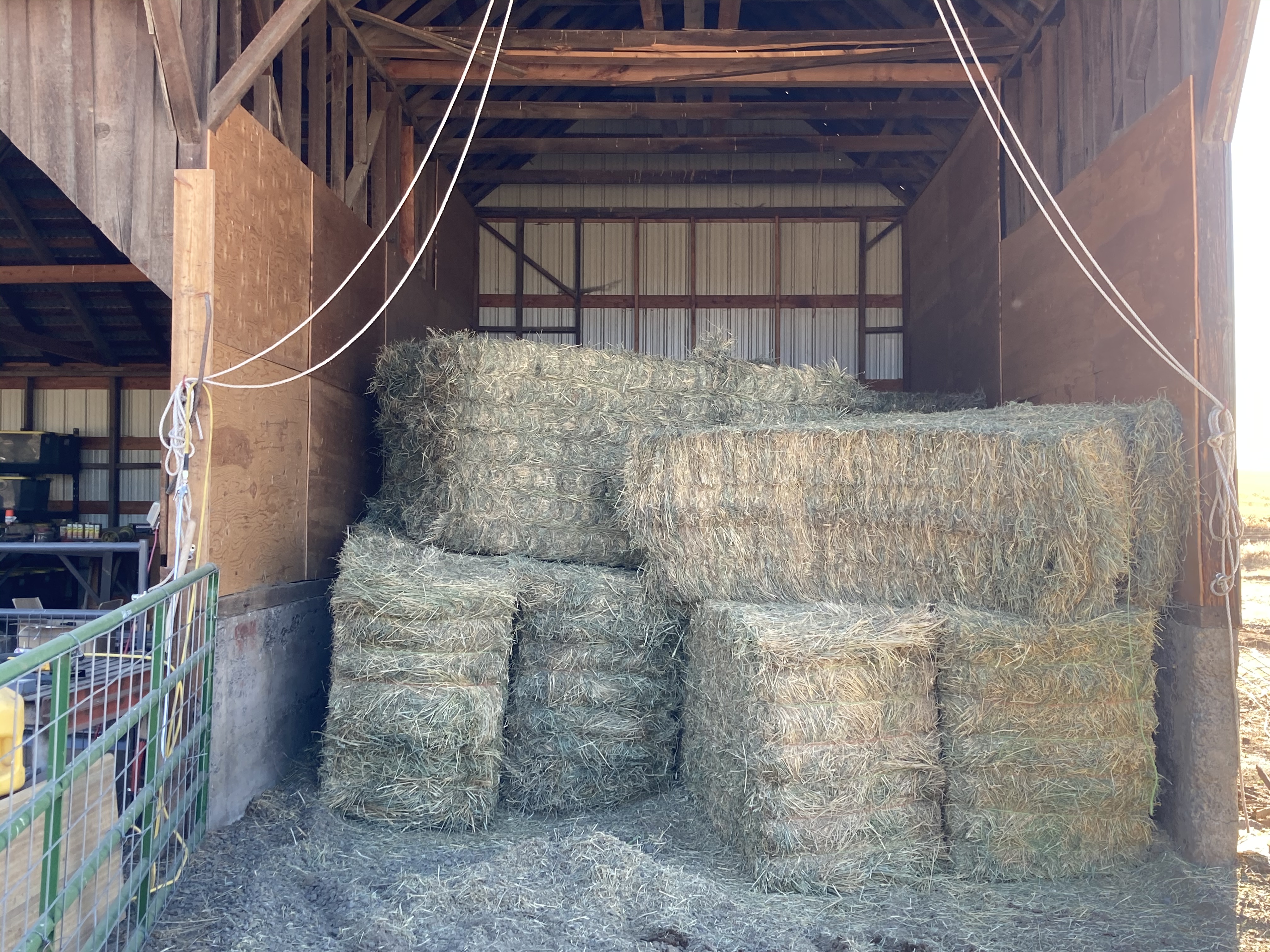 Sunday was spent doing a few inside chores then going outside to push the large bales together from Saturday. The bales are too heavy to lift with my little tractor as it only lifts 800#. I left the manure forks on the bucket so that gave me another 20” of pushing ability. I figured out quickly when filling up the machine shed that it was possible to get a second layer of bales lifted onto the first with some appropriate juggling. Push the potential top bale within about three feet of the bottom row, then stand it up on end and then quickly push the top so it is now leaning upright. Then take the tractor bucket and put it under the bottom of the bale, reach back and lower the box blade to prevent you from tipping sideways or backwards. As you lift the bale, back the tractor up this will cause the bale to pivot and allow you to lift it so it is parallel to the top of the bales then quickly push it forward onto the top of the stack! Now you have double stacked the bales! This sounds easy but it took some trial and error and the tractor being on two opposing tires before I managed to perfect the technique. The alpaca are loving the all you can eat buffet. They are so lazy they will lay down and eat. We have all the hay we need for winter on the farm. I would still like to get 2-3 tons of straw for the barn floor and some protein tub licks for the cows.