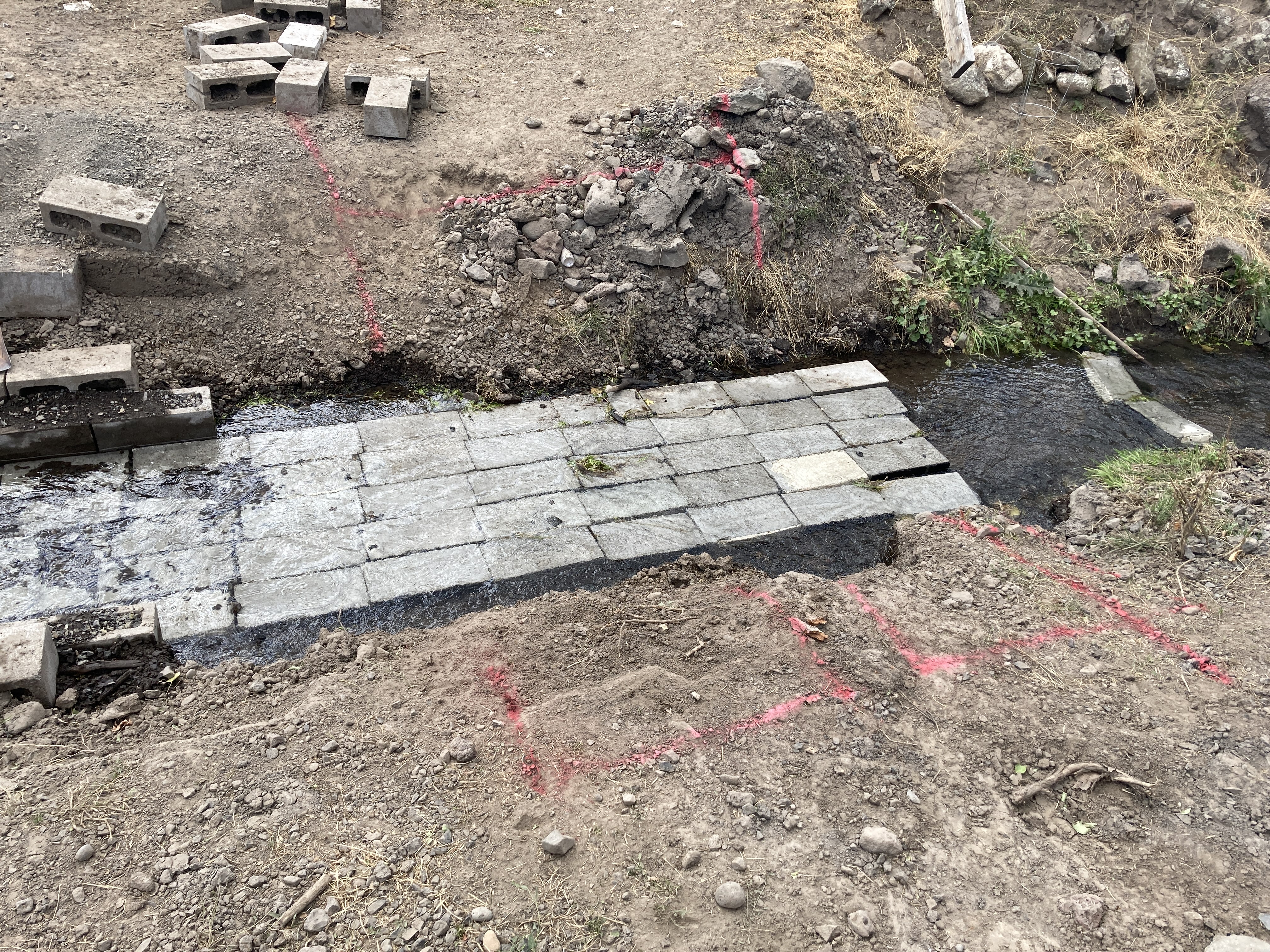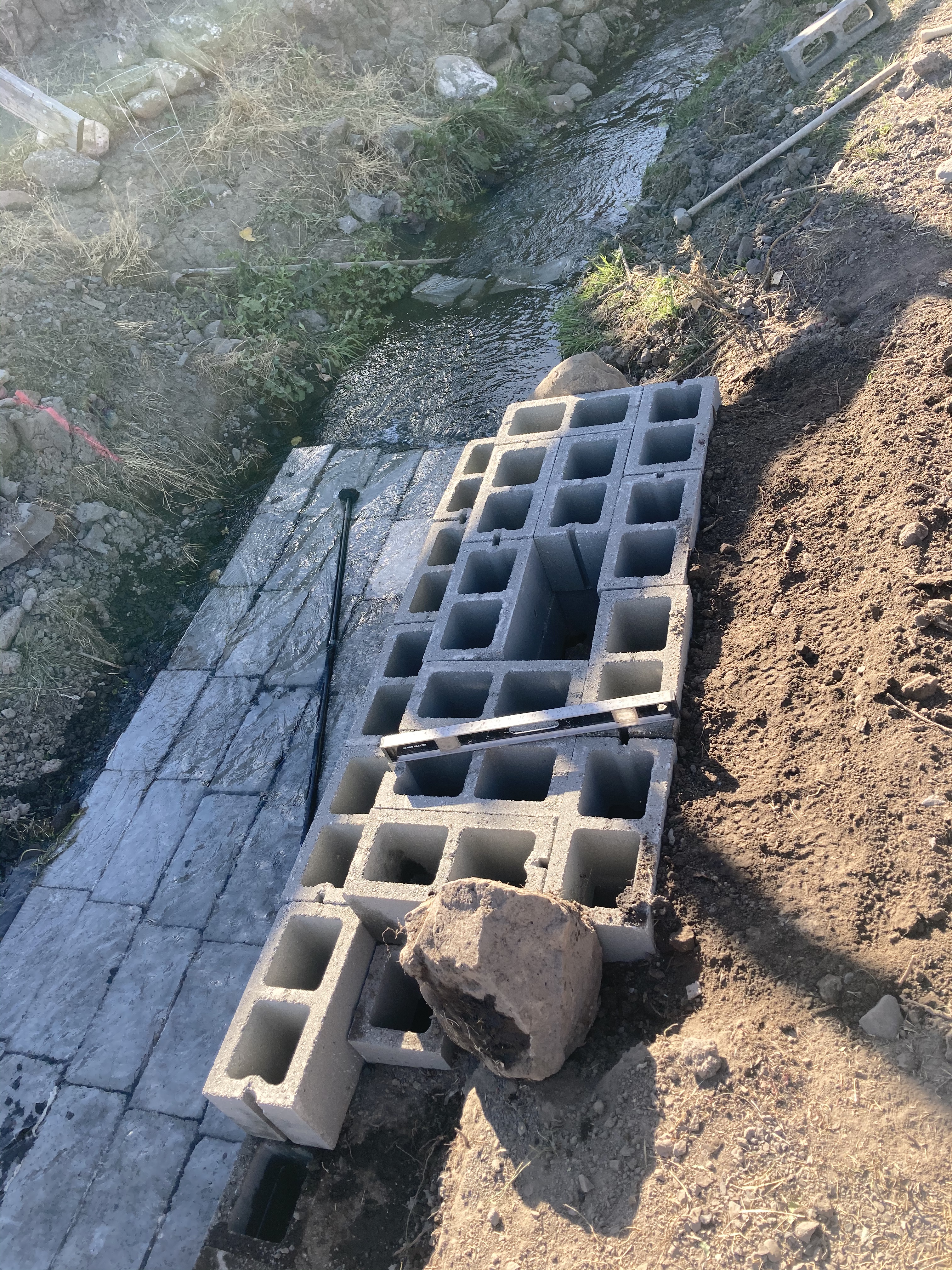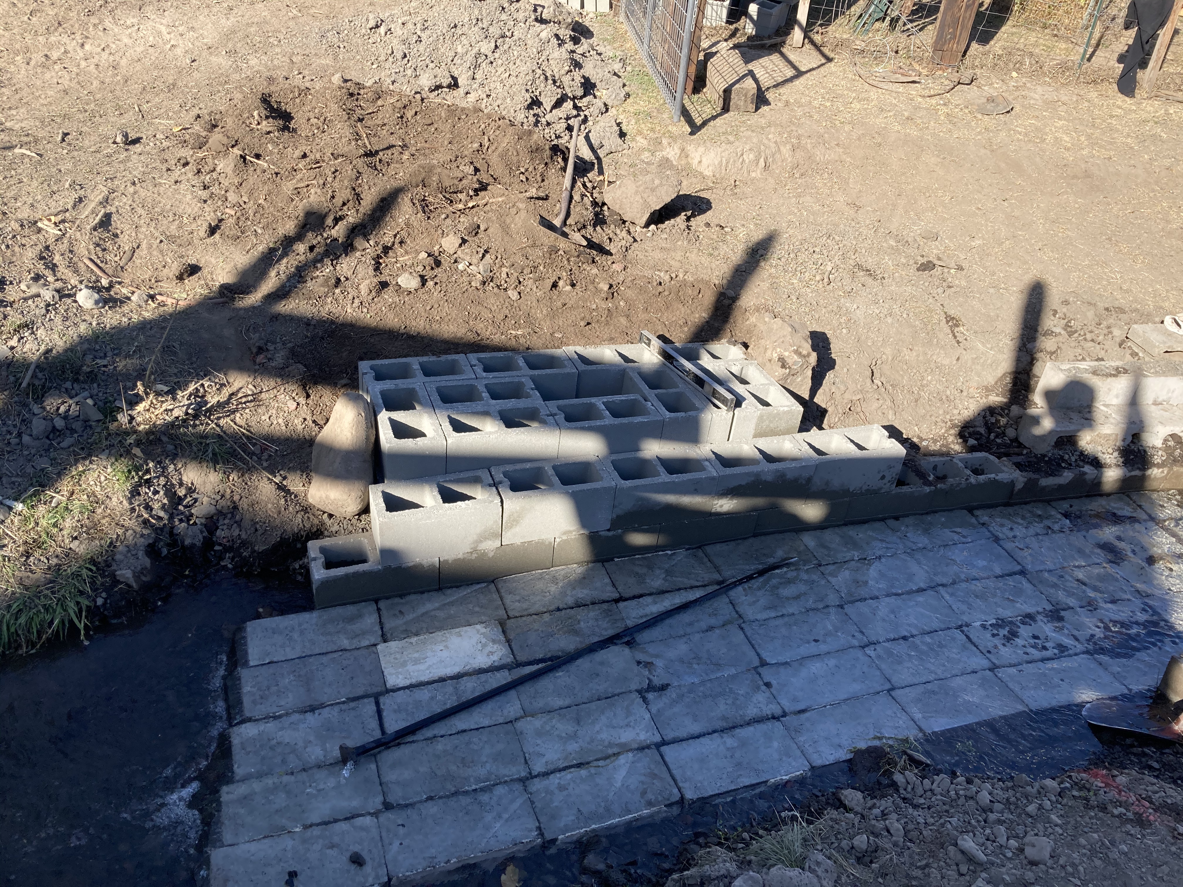 Monday I puttered around the house in the morning, made bacon and eggs for breakfast and ended up outside in the afternoon. I had plans for Mr Ears to dig out the holes for the bridge footings but he was unexpectedly detained and unable to come out to the house. So instead I painted a spot out for both footings and dug one out! It was not easy between the tree roots and buried rocks. I had to use the breaker bar most of the time and only had to break two rocks in half that I could not get out. I set the blocks so they are overlapping and then back filled around them. I will pound in rebar next then we will fill them all with concrete. I want to make one sold piece of concrete for the footing so when it floods again the footings just stay in place and the water will tear out the bridge and the fence. I am going to put breakaway panels on the fence so the water can just push it away from the posts. I am going to anchor the upper sections of fence with rock cribs so the breakaway portions of the fence will give away first. This will cut down dramatically on the amount of fence I actually have to repair in the event of a flood. It took me about four and a half hours to dig the footing and set the blocks and backfill it. So I expect it to take me another 7 hours to finish the other side as the rock wall was only two blocks high not four and that will need to be completed first. Once I have both bridge footings completed I will mix and pour the concrete. I purchased 40 bags so 20 bags per side, hopefully that will be enough.