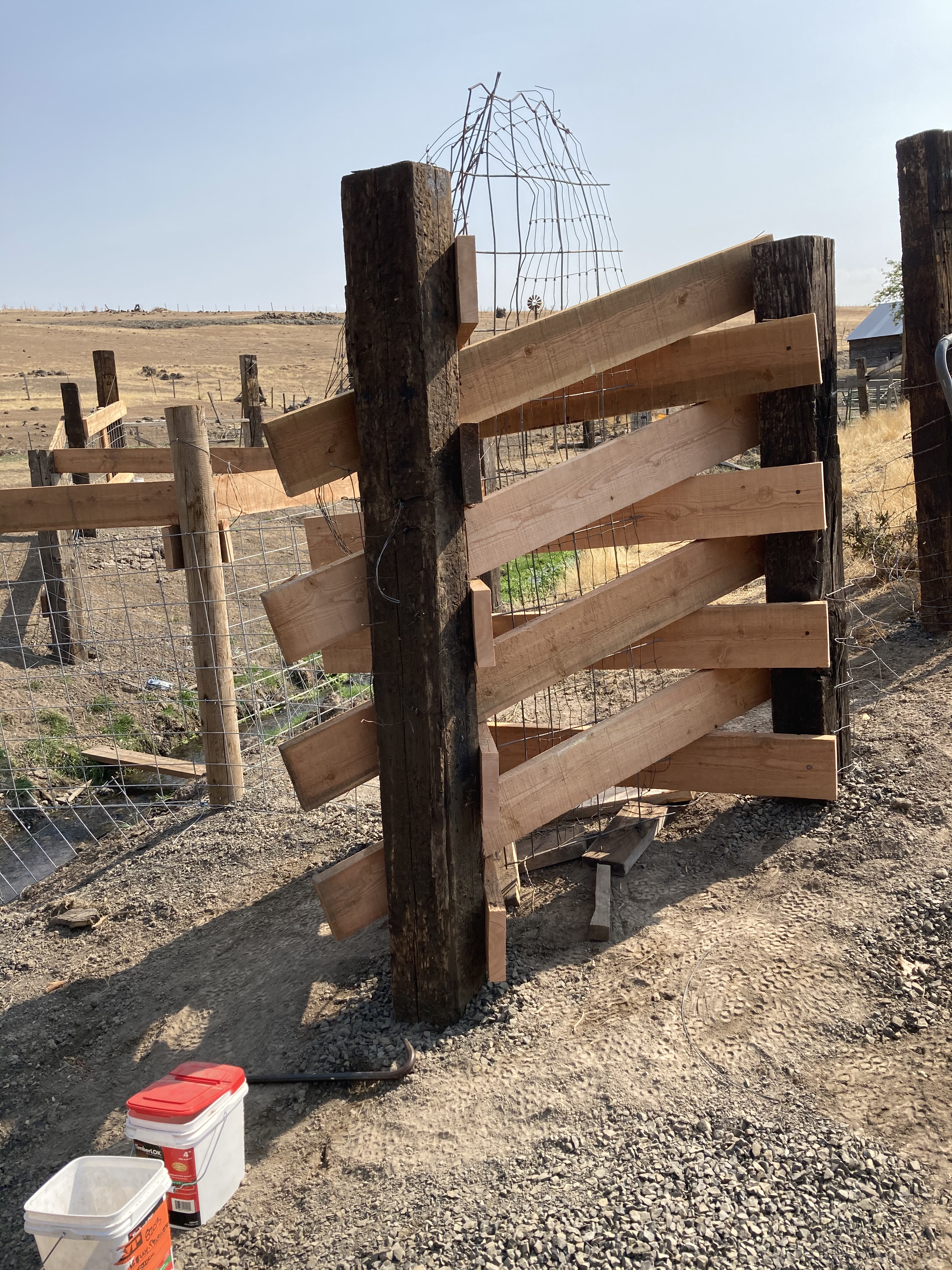 On Tuesday, I worked on the fence some more. I want to get it done but I am down to the little things and I am just not as good at the finish stage as I am at the tear it up and slap it together stage. I finished cleaning up the spring bed and had to move the cattle panels around with the tractor to get them in place. I just could not get them to go together and I finally gave up and disconnected them and reinstalled them one panel at a time. I had the tractor hold the panel in place then I got down and manipulated the panel into place. I just need to install a little bit of ranch panel to keep the sheep in over the large metal cow panels. After that, I mounted the windmill again, this time I moved it so it will not get affected by another flood. Basically, it ended up at my fourth choice because the first one flooded and the other two choices I drilled holes for trees which would get in the way eventually. I wanted a spot I could leave it undisturbed for a few more years. I applied a bunch of new grease to the wheel. It was totally dry but still turning. The wind and on top of the barn now only turns when the wind starts to pick up but I am not crawling 30 feet into the air on top of a metal roof just to grease the windvane. The little windmill is on a pole that I can pivot and lower, grease it and put it back up in under ten minutes. The pole is an old cedar electrical post from when they had knob and tube strung out to the barn. It’s probably over 80 years old and now that it is no longer touching the ground I am hoping to get another 50 years out of it!