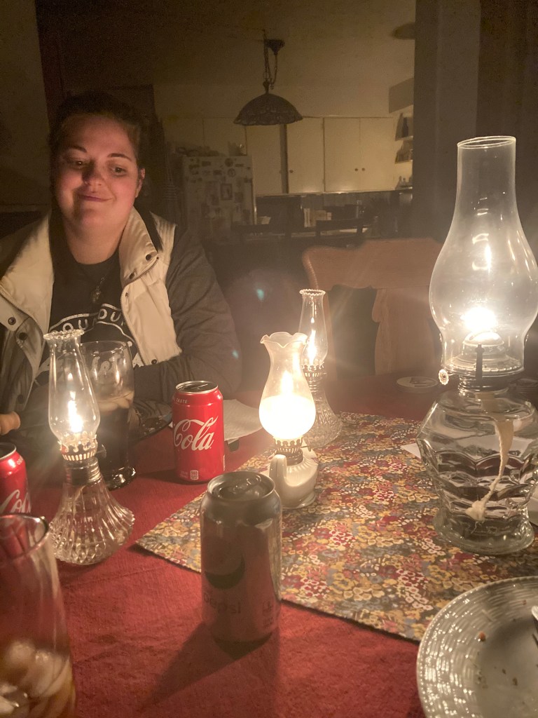We had a power outage last night. Luckily, the potatoes were already baked in the oven, I had already started steaming the broccoli and I had already cut up the toppings. The only thing I was waiting on was to zap the bacon bits in the microwave just before we needed them. Since we have a propane cooktop I just used the lighter to fire up the burner, no electricity needed and the bacon bits got warm and a little crunchier. To fire up our free standing propane stove you just put 4 AA batteries in the holder at the bottom of the stove and turn on the switch and it fires right up! The repair person had just been out 30 minutes before we lost power to put in a new thermostat controller in it so I was able to message him and get a quick answer. We had not needed to do that in the last 13 years. It’s a good thing to know. Sarah opted to stay for dinner as she did not know she still had power at her house. The outage only affected around 25 households according to the power company website. Annmarie checked it when she went in to the hospital for rounds. We had power in the morning! We also figured out that our fancy old style phone was the problem not my phone jack wiring job!! So now we have an old school, no power necessary, phone in our bedroom. We still have a landline. The old lamps worked great once we found them all. They use a liquid wax not oil, its safer and works well.