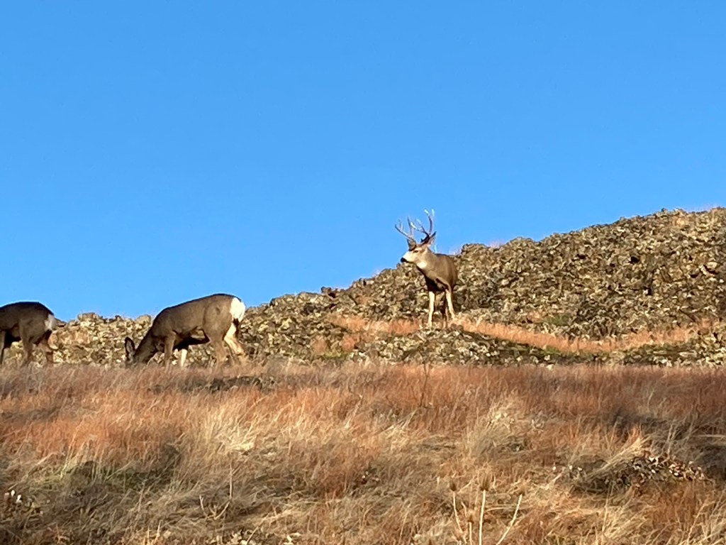 The screwy part was we had a weanling to sell, Valentine, but had not moved him to his new home as we were going to have to run all the cows through the chute to sort him off. He was hiding on the backside of the hay pile in the horse pen so was stuck in the round pen! This meant I needed to hook up the horse trailer so I could just back up to the pen, load him in and drive the two miles to his new house. While driving to his new home about 1/2 mile from our house I spotted some deer up on the hillside and was wondering to myself if there were any bucks left in the area. All I keep seeing on our place are does. It appears that there are still some bucks, I spotted 3 in this group of 8 deer.