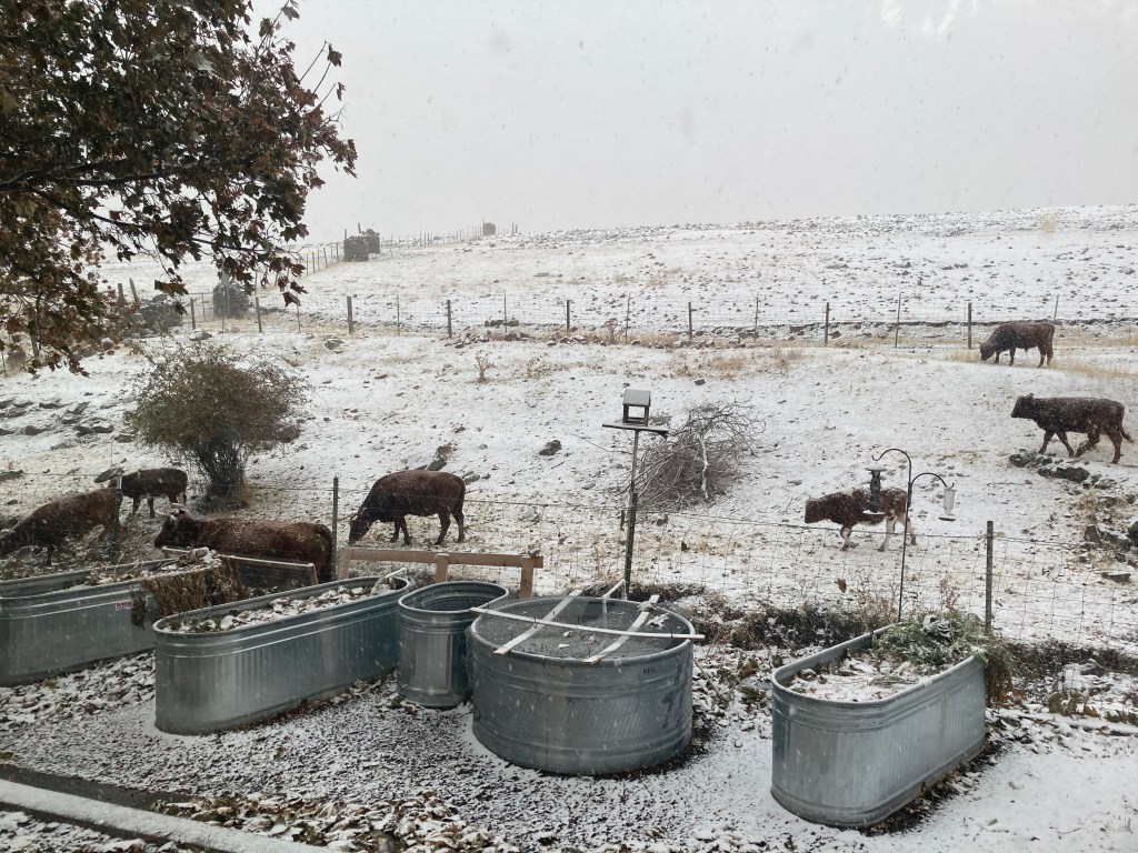 Feeding of all the animals starts in earnest today as there is now snow on the ground. I am headed out soon to push bales out to the cows and sheep. Five sheep will be sorted off today to go to slaughter. That will be the last of the weathers and we will have sold off all the lambs before the end of the year. I am going to not use the horse trailer and put the racks on the pickup. I don’t want to pull the horse trailer in the snow tomorrow. I will have to take my work clothes in with me in the am as I am going to have to catch the sheep one at a time and put them in the back of the pickup. I am not convinced I need a ramp just yet. There is an old one on the property but it needs some work. I may fix it next year when I fix the post hole auger.
