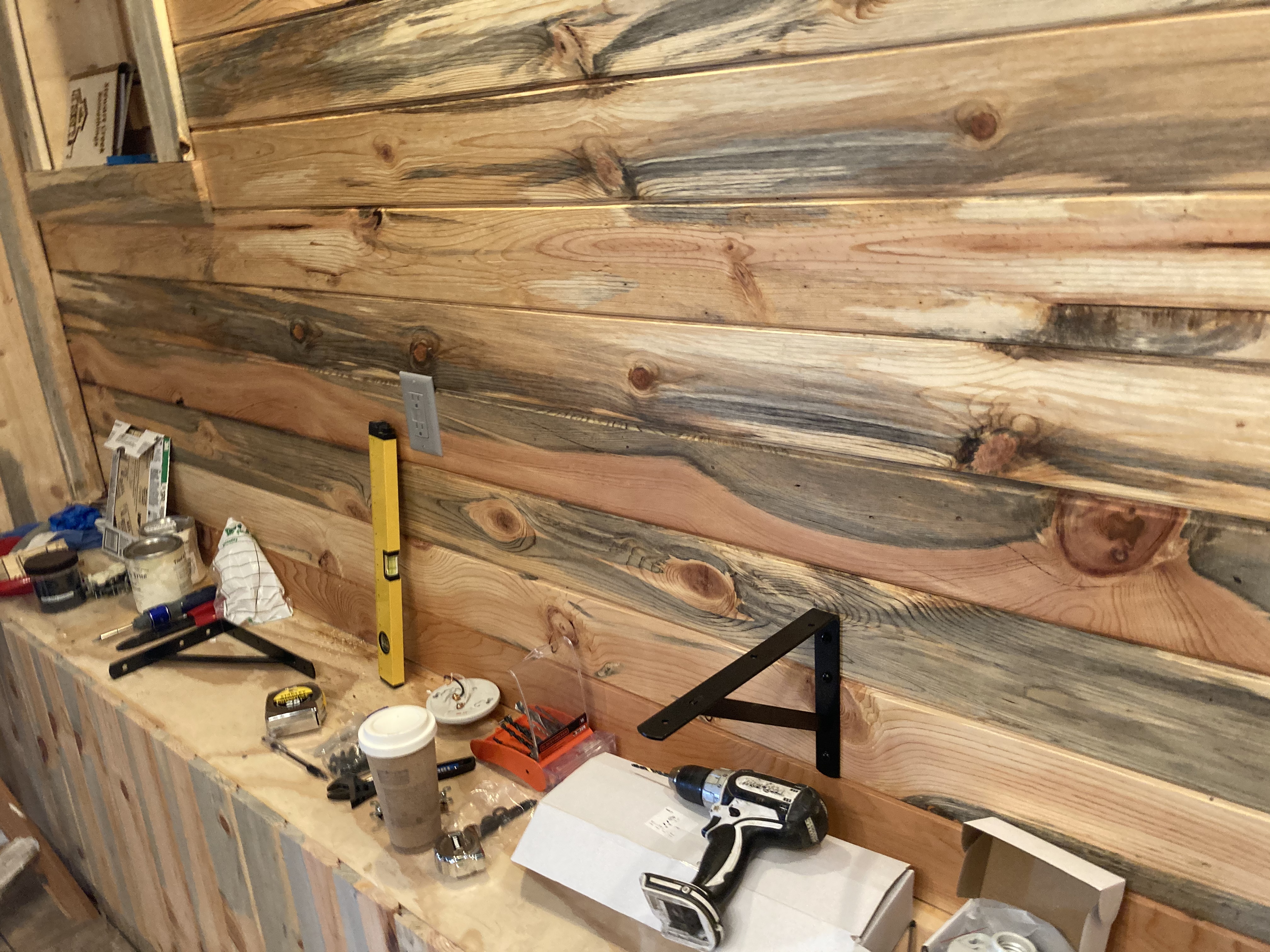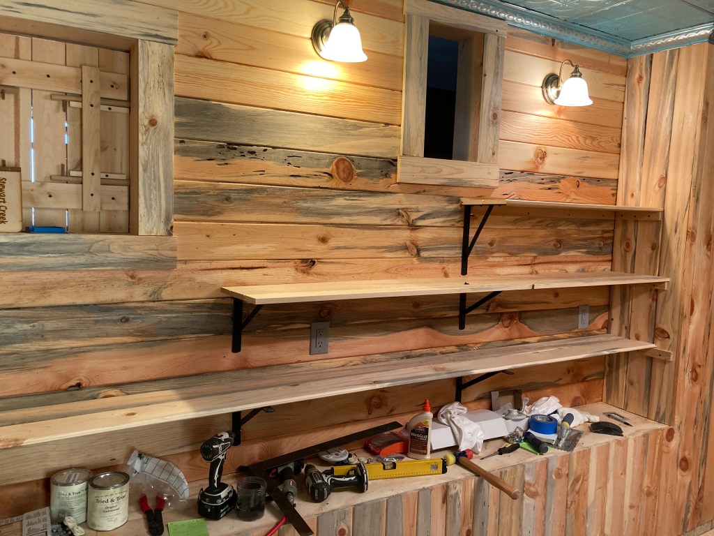 I started out the Sunday by tagging and banding the last two little lambs we had in the barn, a little boy and girl. I then mixed all the sheep together so we don’t have to manage two separate herds. I came in and started working on the bathroom shelves and while outside cutting lumber heard some squawking. I looked around the edge of the house and there was our pretty rooster in the front yard desperately trying to get through the metal fence to get away from the dogs. Unfortunately for him, he is too big to fit between the gaps. I was able to call the Border Collies off but our little ankle biter Brussels Griffin, Gizmo, did not want to leave the chicken and had to be hollered at. I tried to open the gate but that just confused the chicken and ended up just having to reach down and grab him and toss him over the fence. He got lucky and only lost about 30 feathers. I have no idea what he was doing in the yard, the chickens know it is not safe.