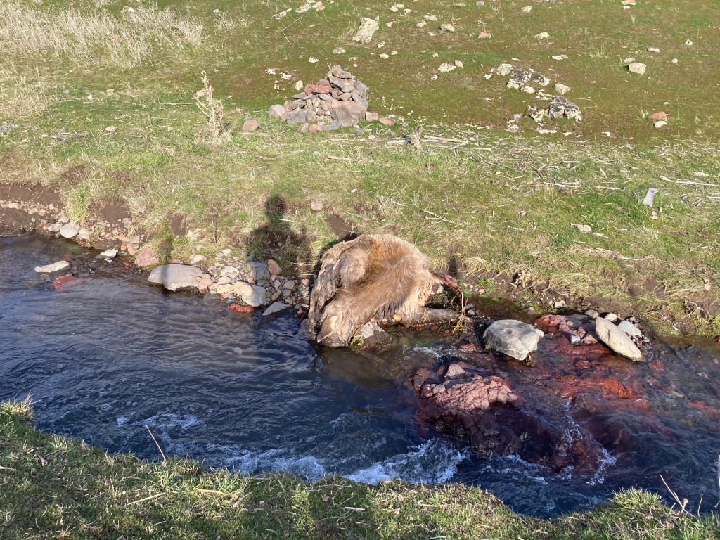 While I was messing with the culvert I spotted something in the back runoff creek. I wasn’t sure what it was but it looked like an animal carcass. My only thought was I hope it isn’t and if it is then please don’t let it be so decomposed that I cannot just drag it out of the water. I was able to just slide a chain around its neck and pull it out of the water. It had been dead for a few days only so it was still intact mostly. I took it up to the boneyard and then came back for the stillborn lambs, dead lamb and dead alpaca. It smelled bad but managed to stay in one piece while moving it with the tractor. I was eternally grateful that the carcass only smelled a little bit.