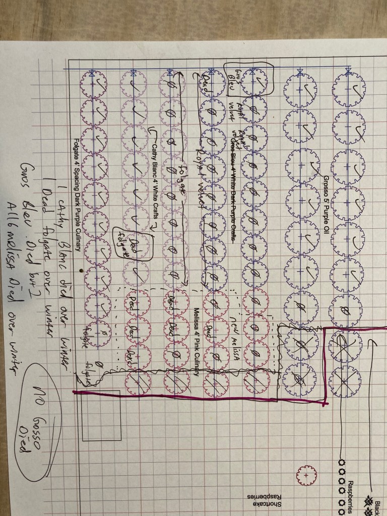 Mr Professional came out and planted the rest of the Lavender. Annmarie found our old diagram and I was able to update it. We still have eleven spots that need plants but I think we actually may get some lavender from our Grosso plants and maybe even the Folgate. We will see, every one of our Melissa plants died over the winter, we replaced every one and added some more and will see how they do this winter.