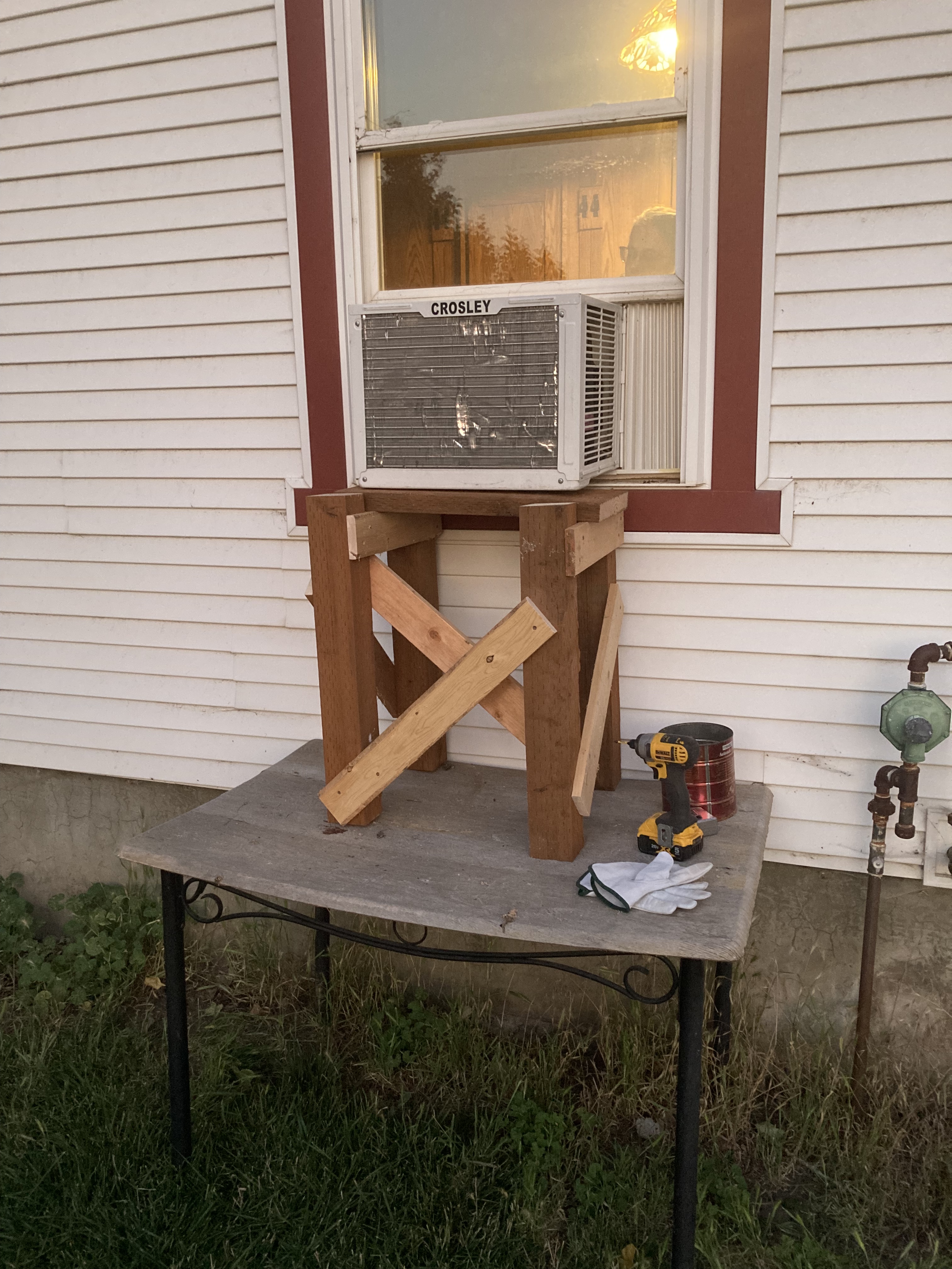 It turns out my mother had an air conditioner for the shop that she was not using. We thought abut putting it up in our bedroom but it really needs some external support. We ended up putting it down in our craft room with the Murphy bed! That bed is turning out to be on of our great purchases of the year. It is getting a lot of use. I had the saw set up and an old table I had not yet discarded and in an hour we had the stand built and the air conditioner installed and blowing cold air! It was the best nights sleep I had had in one week. The house only got to 79 degrees with the new setup. This is much better than 90, sweat does not run down my back just sitting in the living room now.