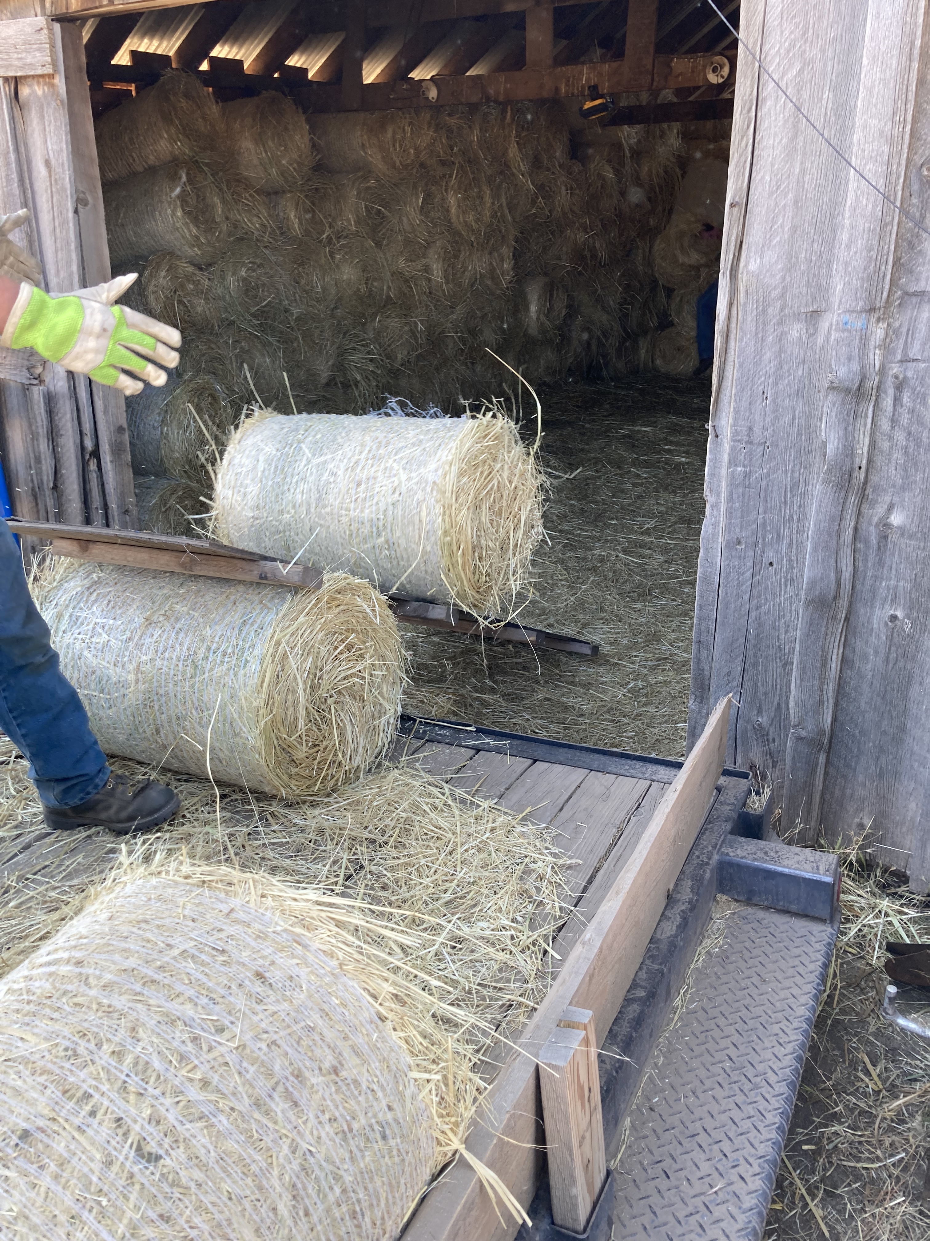 Mr Rainman came out today with his wife, Gimpy today to help me pull in the last of the hay off of field #1. There was quite a discussion had, some whining, about my choice of names for helpers. A final ruling was made that a name is given on the very first day you come out to the farm to help and it is never altered. Yes, it may not be as pertinent but unlike your birth name there are no do overs or changes allowed. So Gimpy, without the injured leg, helped load hay today. We pulled another 174 bales off of the field. The best part of this was that our main barn was full so we had to use the lamb shed. What a sweet deal!! Mr Rainman said if I just tossed a round bale on the edge of another by the trailer it would spin and then roll all the way across the ground to the hay stack. This worked fairly well but during the second load he suggested we use the trailer tail gate as a ramp, pure genius and worked perfect! This made unloading super easy. Gimpy decided that the owning a farm was not in her future.