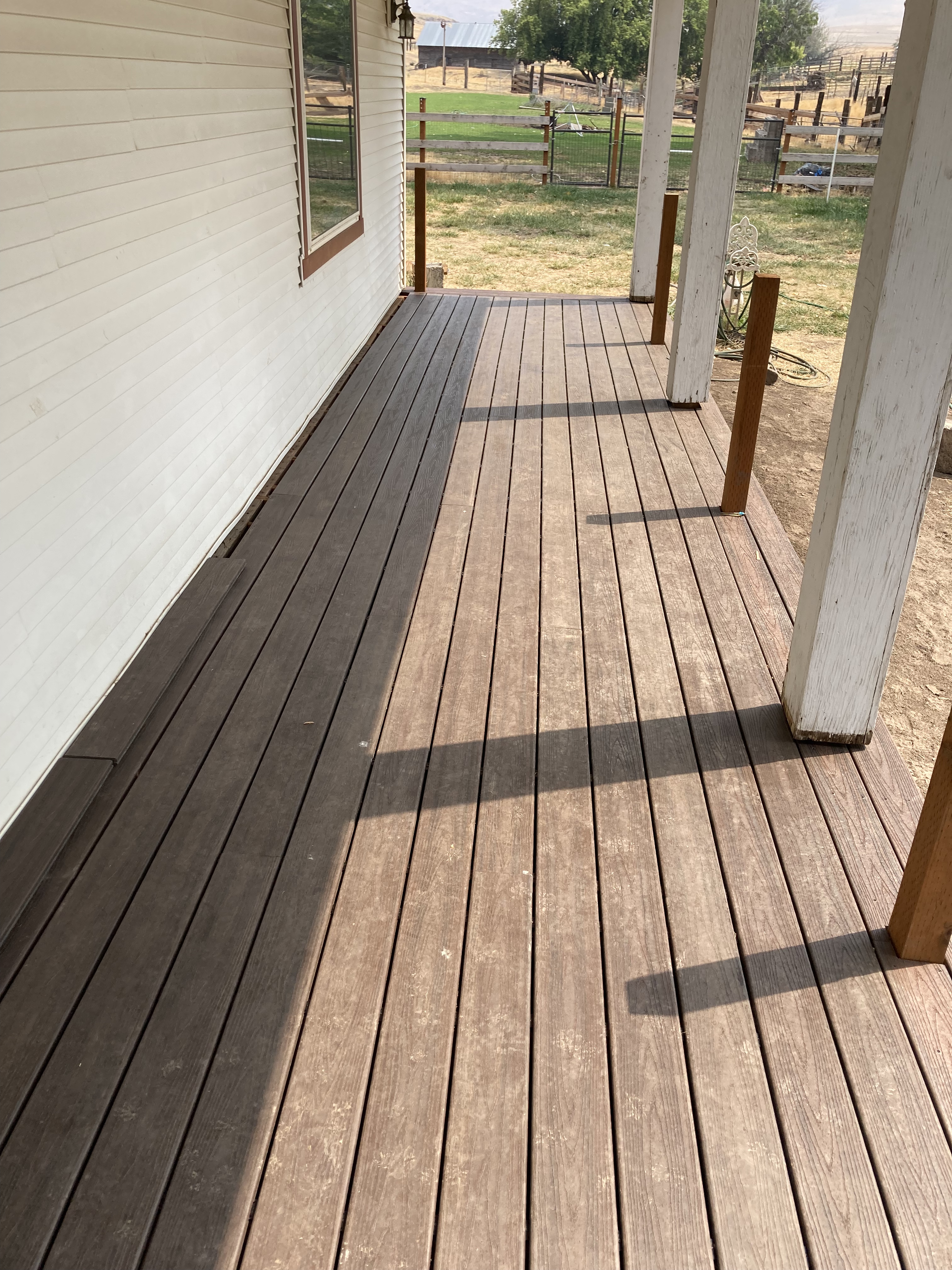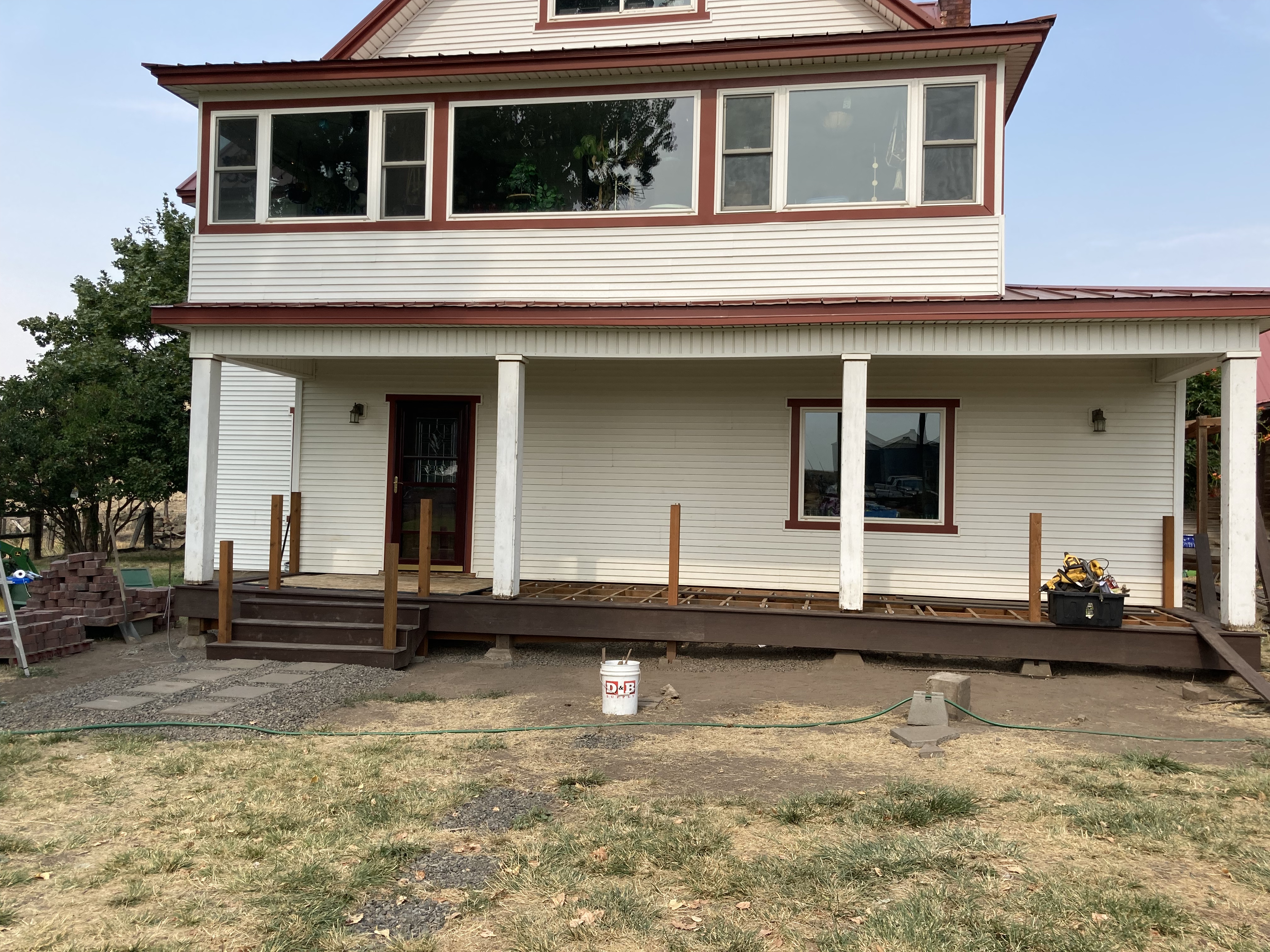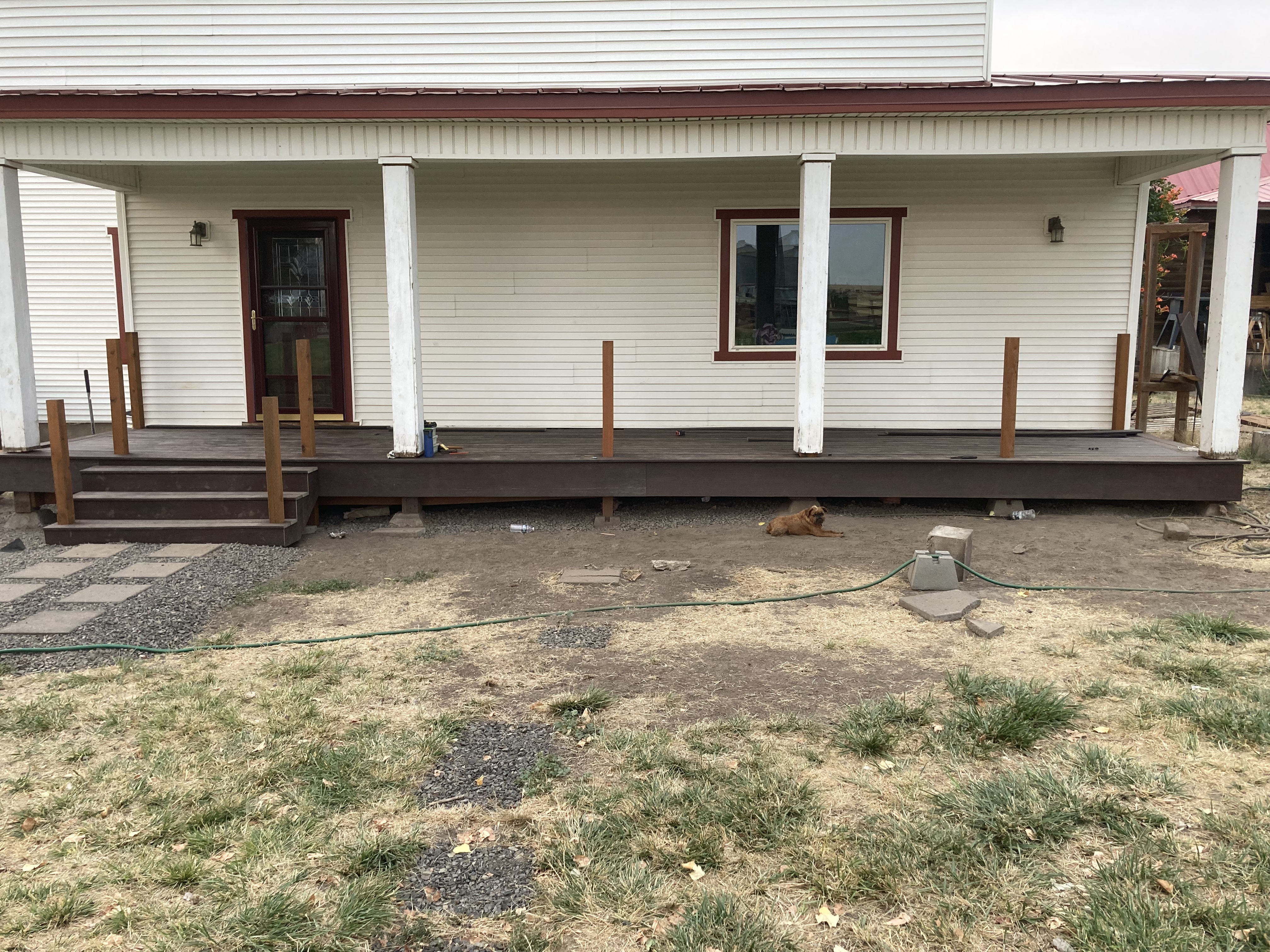 Saturday Mr Rainman and Mr Professional laid out all of the decking and got it cut to fit the entire porch. Yep, I did not order enough decking either. Now in my defense we used the TREX deck estimator tool online. But I did not insert exact measurements and the calculator does not add 10%. You must add 10%, because there will be mistakes. I now have to order three 16’ boards, it should take a couple of weeks for them to get here.