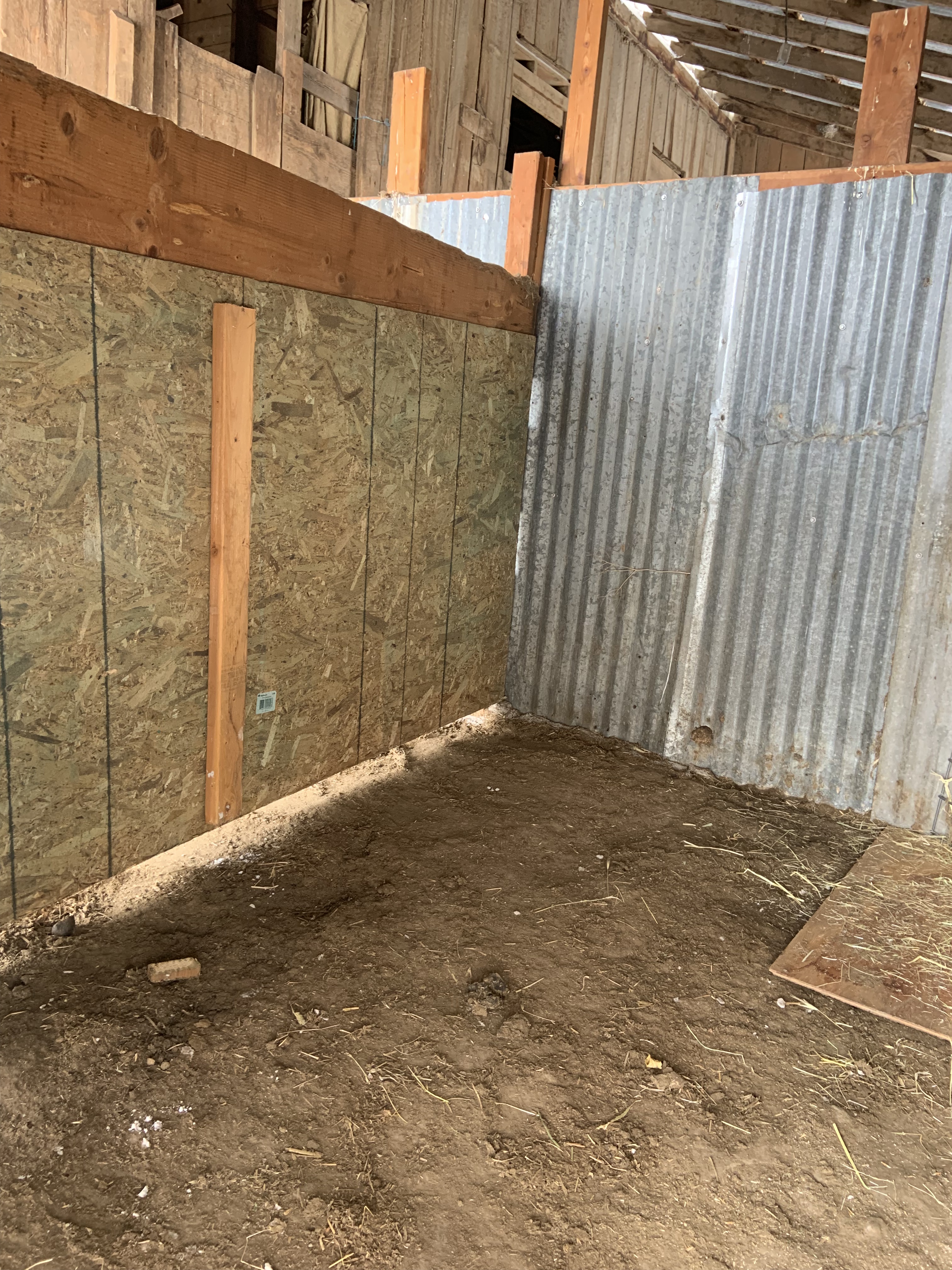 Sarah and I went out to feed this morning and Annmarie wanted us to convert one of the horse stalls into a shelter for the four sheep/rams/weathers. The wind is blowing in snow so she wanted us to stop that somehow and make a spot to feed the sheep that the horse cannot get into. So we raided the wood stash in the machine shed and went out to the barn and built something!