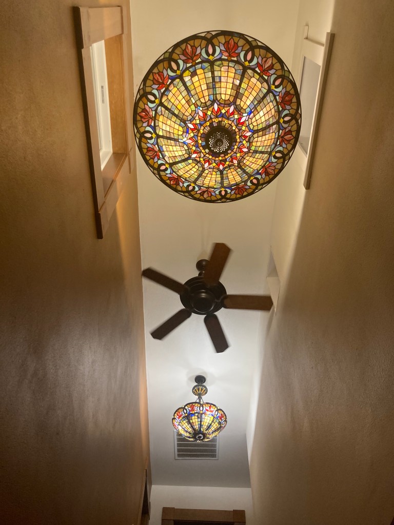 When I was doing the same to our large stained glass light I found a solid layer of dust on it and two of the six lightbulbs were burnt out. I ended up having to wipe the whole thing down and vacuum down the walls to remove dust laden cobwebs. I am forever grateful I had enough foresight to cut the access holes into the bathroom walls to allow easy access to the stairway ceiling. The stairway is a lot brighter now!