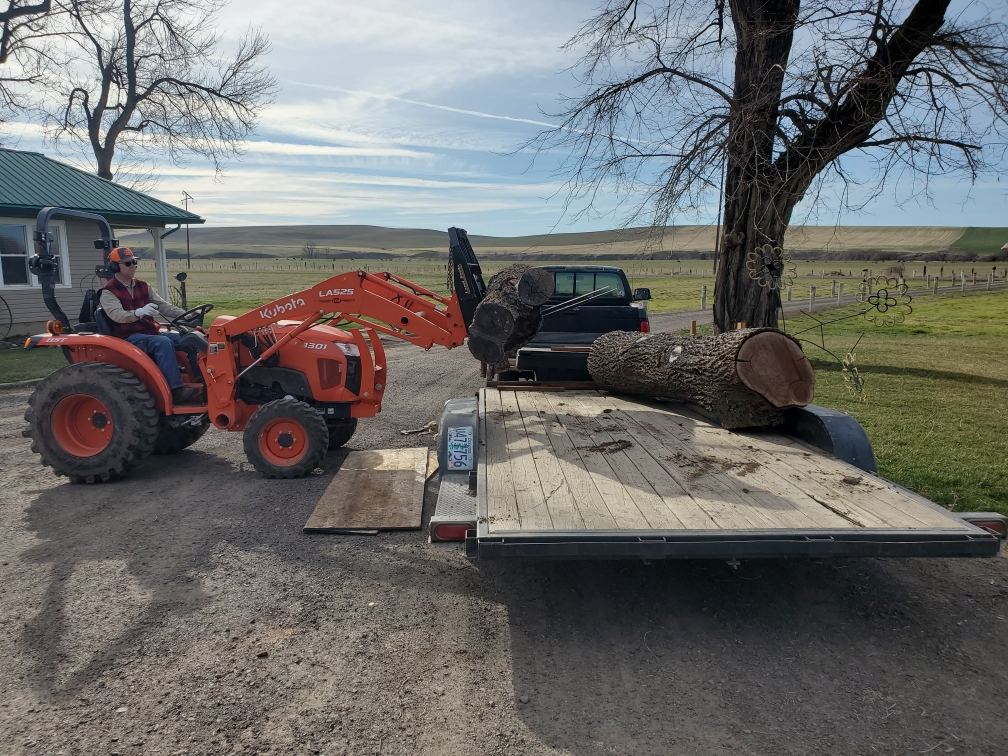 Friday was spent playing catchup. The weather is 50F and sunny which is not normal for February. It’s more like late March early April weather, which is so screwy. I had a friend who had offered me an old dead black walnut tree so Mr Professional and I loaded the Kubota onto the trailer and went over attempted to load the pieces. We had to cut them down to 9’ sections and the last one was so big we could not lift it. We tossed down the ramps and then tossed a piece of OSB flooring down and then used the tractor to roll the log onto the back 1/3 of the trailer. Once it was rolled on we just strapped it all into place so nothing moved and then headed home. We took all the back roads and only had to go about four miles so Mr Professional just drove the tractor back home as the trailer was now full. We took the wood down to the custom cut place and he will call me when its time to cut it. I need the strapping tool to come in the mail so after its cut we can stack it in the chicken coop and strap it all down then ignore it for another couple of years. I think I want to use a small piece to finish the upstairs bathroom countertop next to the toilet. I was thinking about using a live edge piece there.