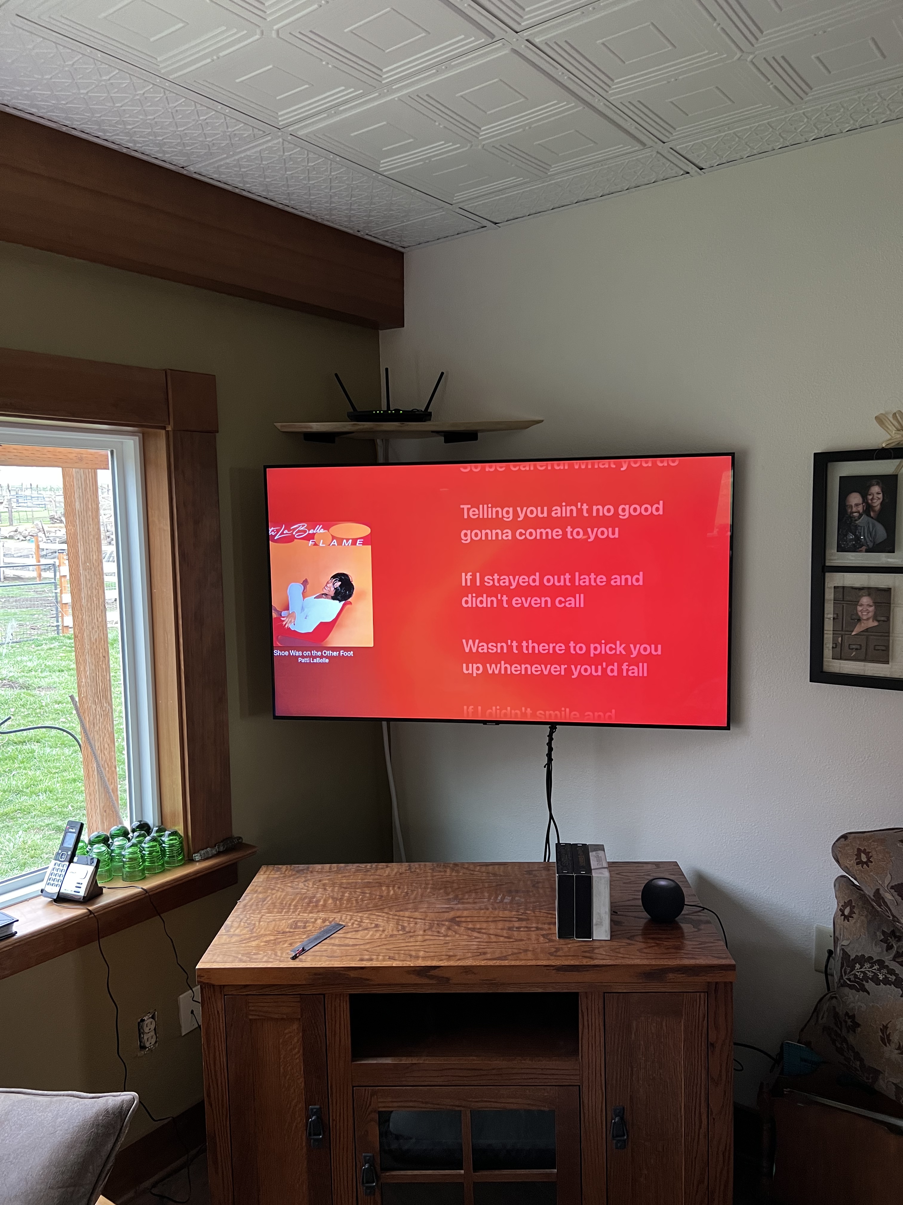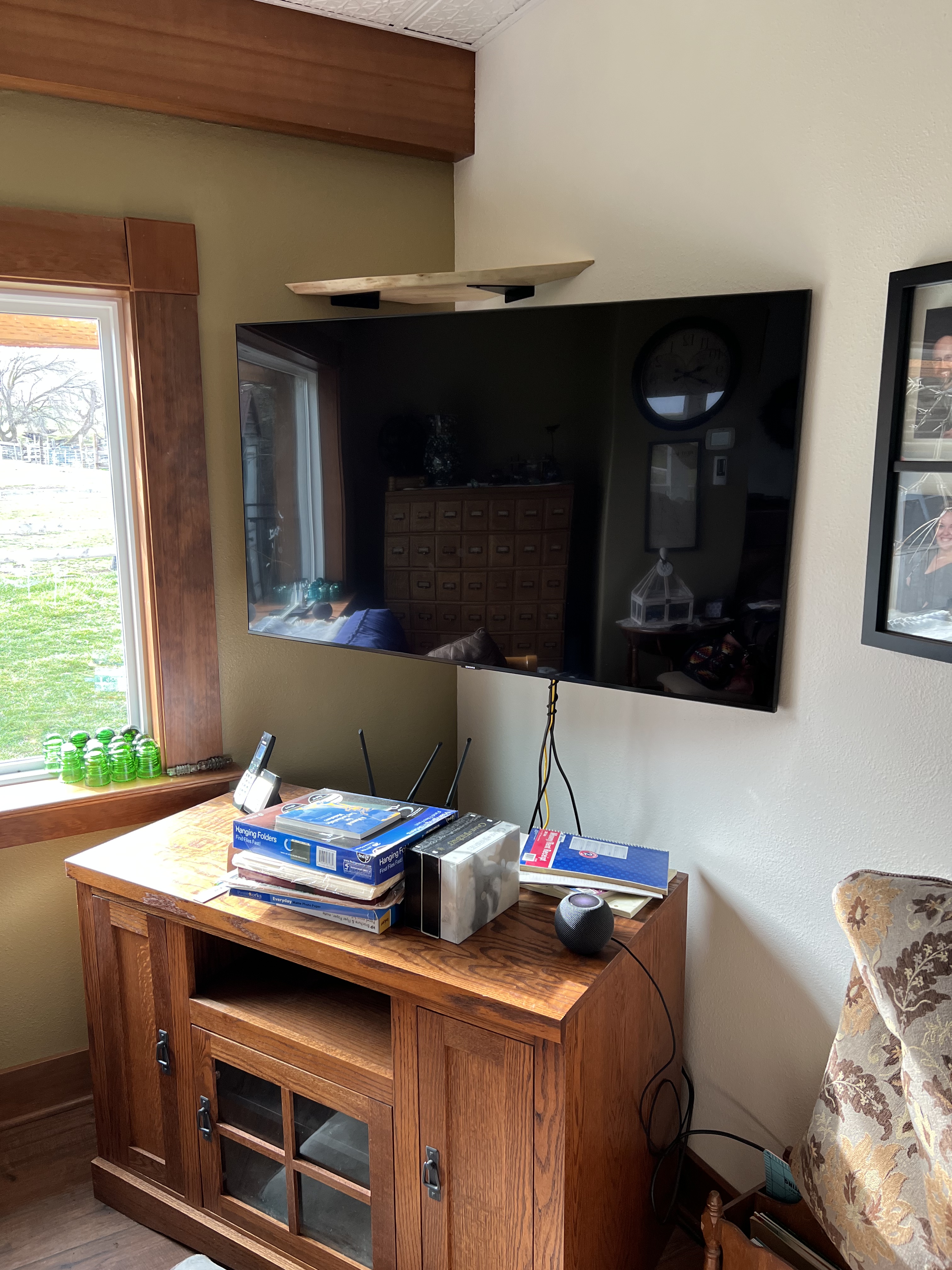 I took the time to brush the horse. She is shedding something fierce and without another horse buddy to help her groom she needs some assistance. I have brushed her twice this vacation and Sarah brushed out the dogs when she was home so everyone looks pretty good. We came into the house and took out the old TV stand. It is very heavy but Annmarie reminded us we have the shoulder furniture movers so we found those and it made moving the stand an easy thing. I moved the new chest into its spot after cleaning the floor and doing some cord management stuff to organize the electrical mess. Annmarie wants us to use a piece of plastic channel to contain all of the TV cords to make it neater. When that comes we will install it, it does look a lot nicer with the cords contained.
