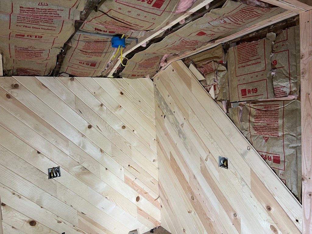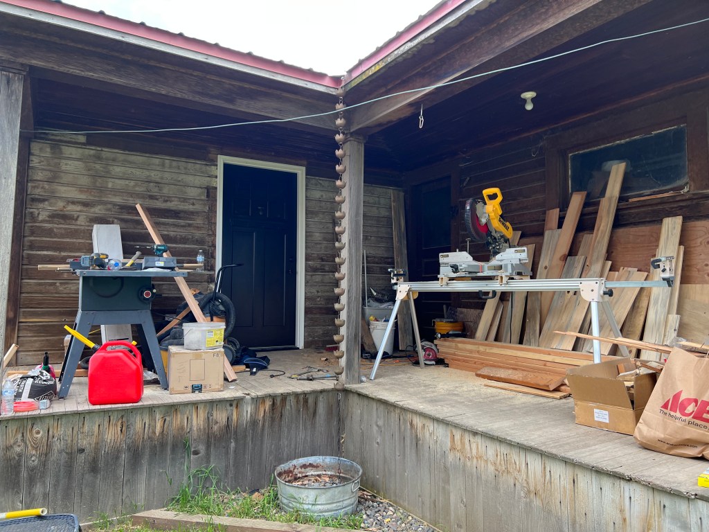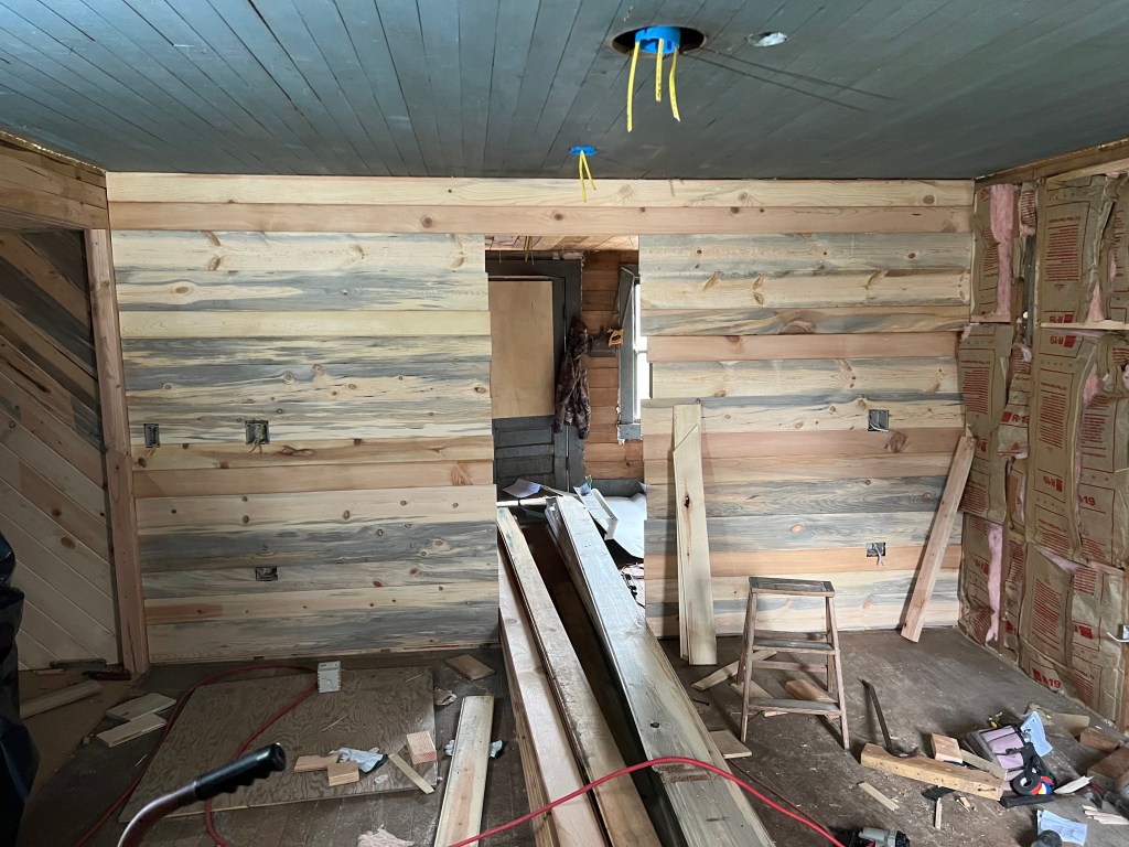 We decided to keep going and installed the door handles. Everything worked except the deadbolt plate will need to be carved out to fit the metal housing that came with the door handles. The weather was off and on rain coming down all day long. We don’t have enough space in the house to bring in the juniper for the ceiling so it is out on the trailer, covered with a tarp. Some of it is getting wet. I figured once we got it all pinned into the ceiling it can dry in place.