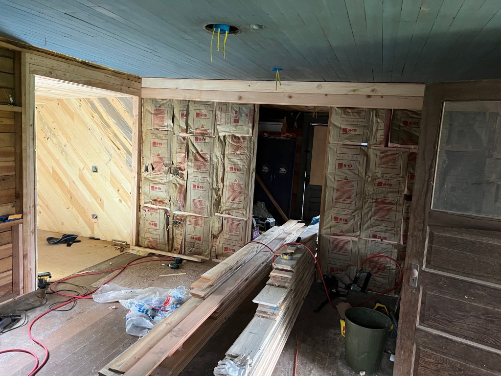 Saturday I took the time to eat full breakfast before heading out to the old house office project. I never stop for lunch on the weekends when I am working on the farm. So I try and get my lunch and breakfast calories all at breakfast time, coffee and the occasional water will keep me going the rest of the day. I headed out to the old house to begin work on the wall, Mr. Professional was scheduled to show up in a little bit. He showed up and we proceeded to finish the dividing wall, roughed in the new bigger door opening and then we set the new door! The best part of the day was that we had the new door set, level, shimmed and installed in under one hour! I have never installed a door at any time in an hour. Outside doors usually take a lot longer than that by the time you get done adjusting everything to make the door work properly.