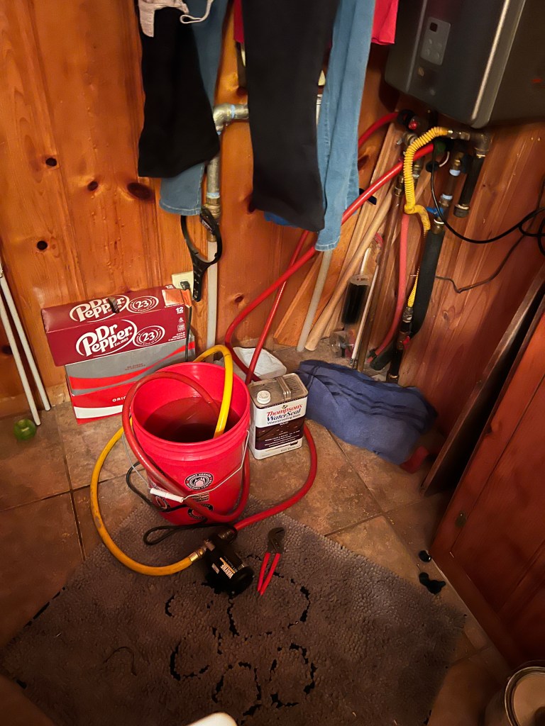 I was super stoked about our progress, so much so that I decided to tackle one more project that evening. It was way past our time to clean the instant hot water heater for the house. I had a sump pump that I had to clean the mud out of as I usually use it for water leak hole pumping. I then had to make two more hose fittings to hook up the circulating vinegar up to the water heater. The first version blew vinegar everywhere and I had to redo one of the hose fittings to a new one. I finally got it to work, we have the correct valve setup that allows us to isolate the heater and run vinegar through it. I had to hang out in the laundry room while the vinegar circulated so the hoses stayed in the five gallon bucket. My worst nightmare was trying to mop up four gallons of vinegar off of the floor. So after two hours of cleaning, I unhooked everything and circulated water through the heater flushing all of the vinegar out. The next day when I went to take a shower I noticed a markedly different heat level. The water felt several degrees hotter than it was prior to the cleaning.