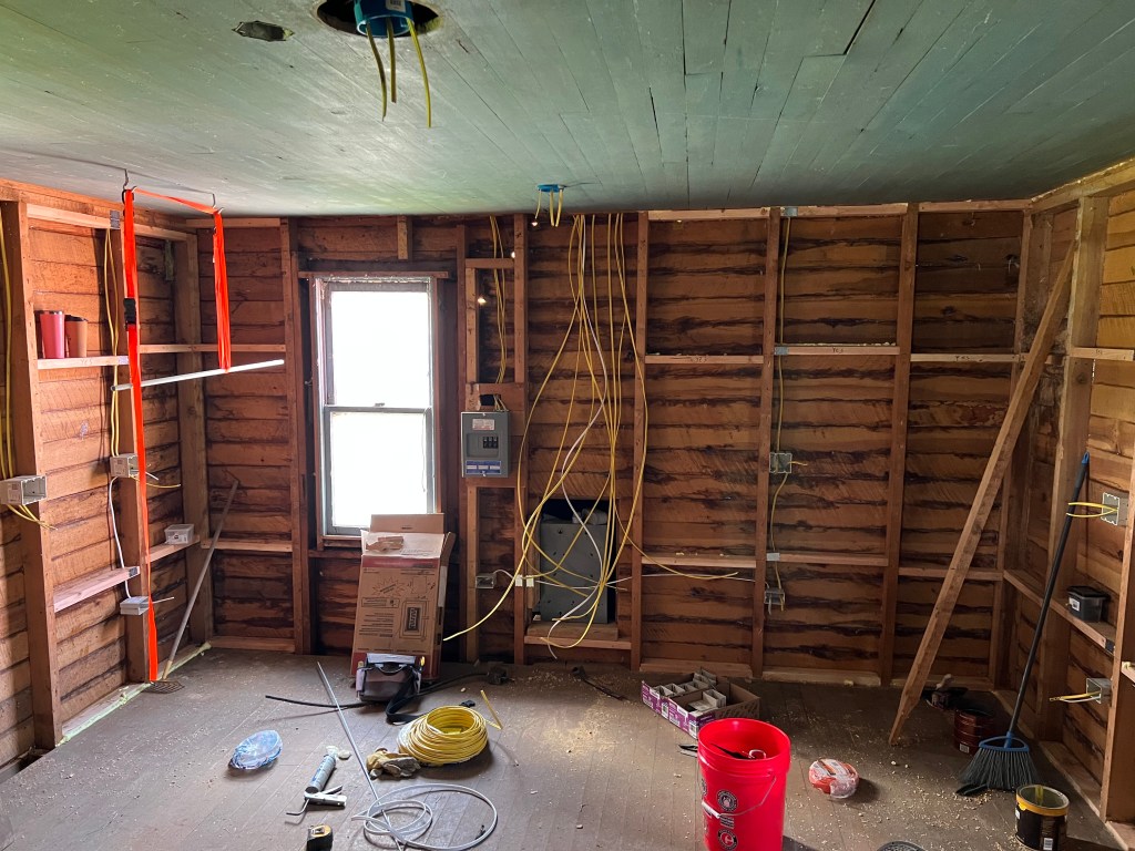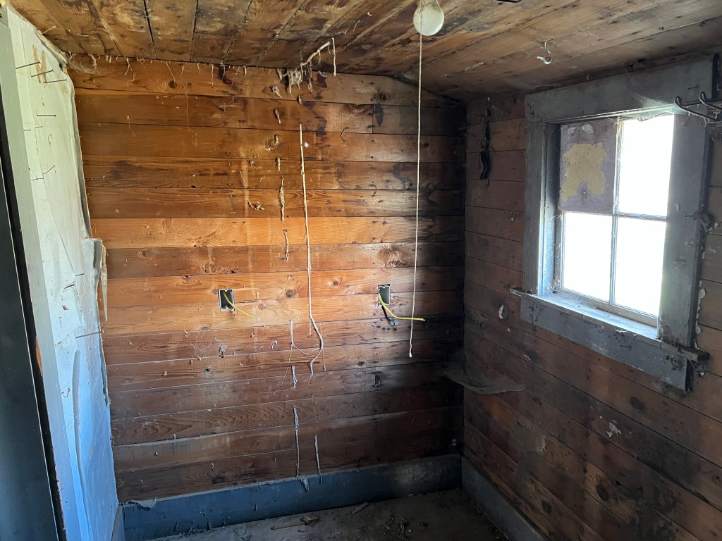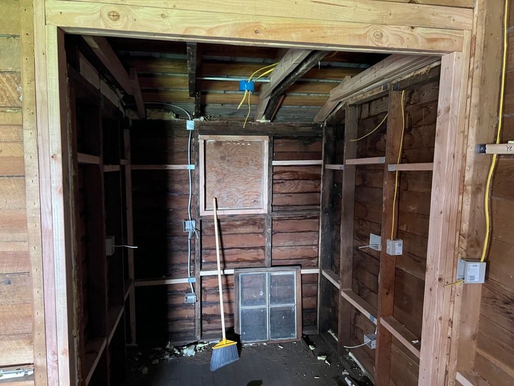 I keep changing my mind on what to do with the walls and ceiling. I was going to just paint the ceiling and do the walls in pine. I have some 1×6” and 1×10” boards and I was just going to butt them up to each other. This won’t look amazing but would work. I am not going to do that. I am getting tongue and groove juniper for the ceiling and tongue and groove blue pine for the walls. I want it to look pretty! I am even going to install it on a diagonal. It will hit more boards that way but will look prettier also. I will use the plain stuff to sheath the new freezer room walls. We are going to do that room at this stage but it doesn’t need to be fancy. I am even thinking about leaving the original window in the room. I think I will for now and then this summer decide if I need to install a thermostatically controlled vent fan to make sure the room doesn’t get too hot. I am hoping that if I insulate the room well I can keep some of the extreme heat out.