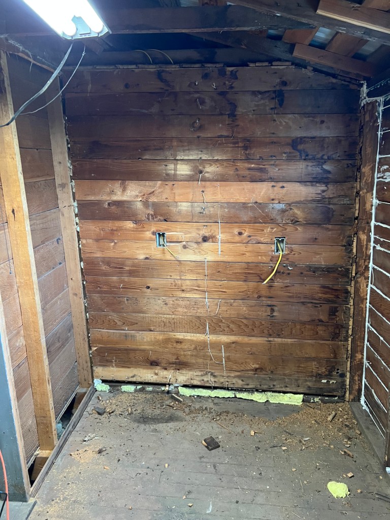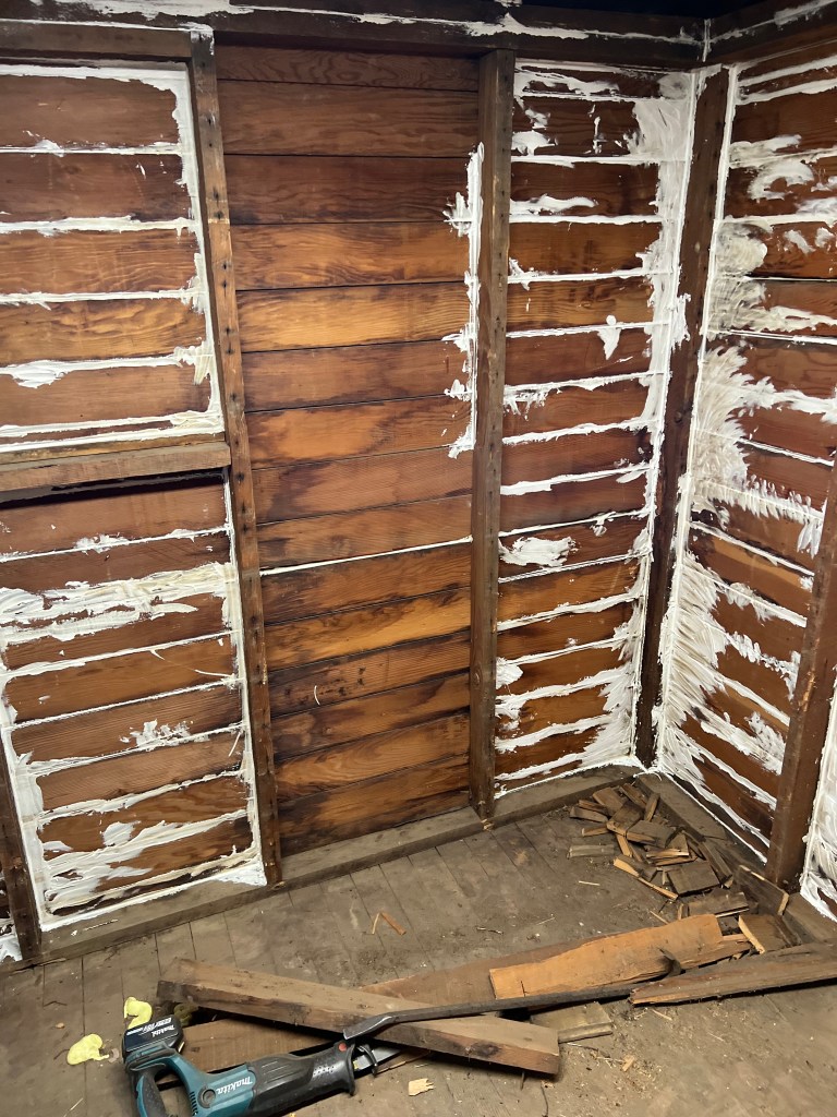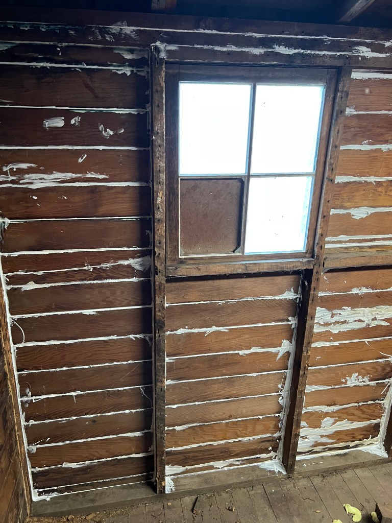 I still had more time left so I went into the freezer room and finished cutting out all the boards in the corners of the room and decided to start caulking. I bought more caulking and managed to make one tube last through 1/2 of a stud to stud section. I kept after it filling all of the seams from the outside boards. I did not want to paint the walls and the caulk did a great job of stopping the weather and wind out of the main room that I figured I would go with a thread.