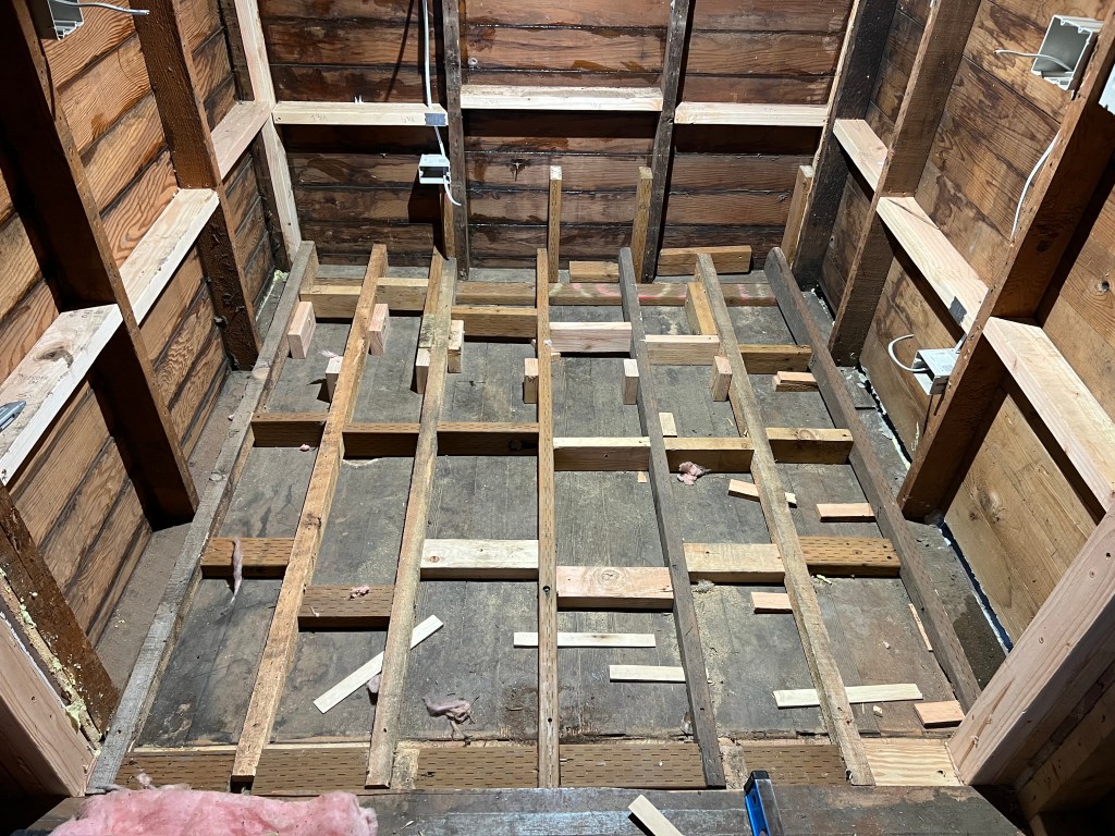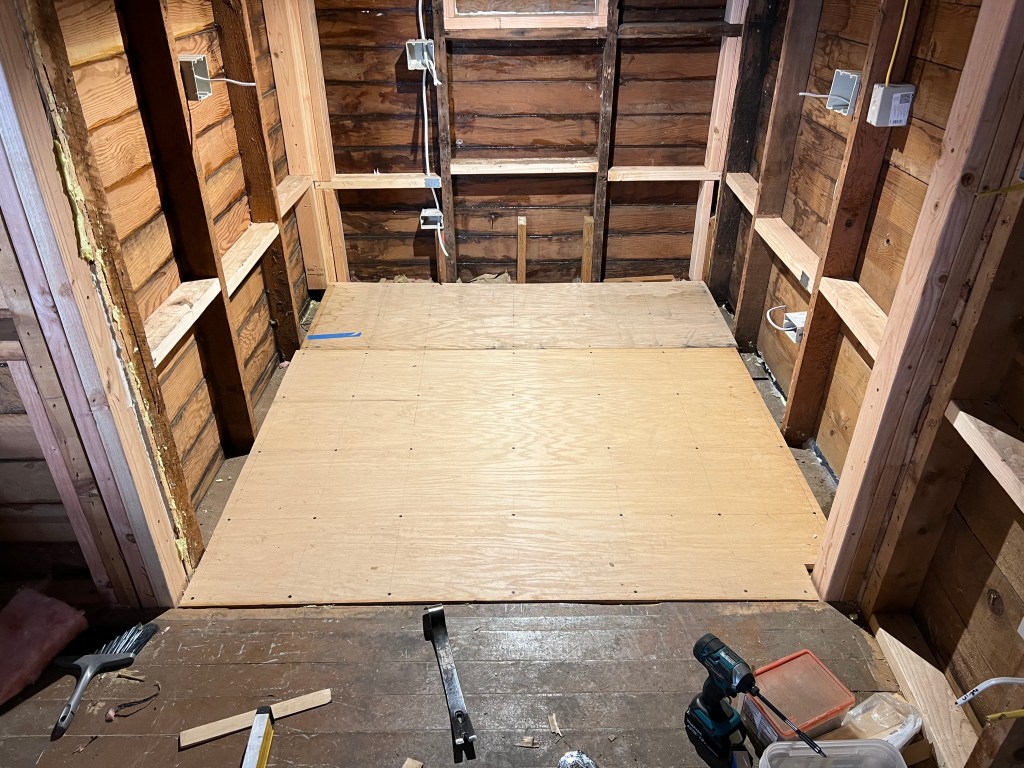 I verified Friday night that my help would be coming tomorrow. On Saturday morning, both my helpers bailed for other things. I was going to fly solo all day long, which shot down my plans to pull wire and finish rough wiring the house. Instead, I focused on getting the old bathroom floor in. The floor must be level for Annmarie’s laser cutter and plastic 3D printer. So I bought a four foot level on Friday and used it to shim the framework until I had it level. Once it was level and screwed back down to the floor, I cut and fit insulation until the entire floor was insulated. I went and cut out the 3/4” oak plywood pieces. I fit both pieces down before screwing any of them in place. I drew out 1’x1’ grids on the floor and then predrilled holes though the plywood. I put a long 3” screw through each intersection so they would show a pattern on the floor as the screw heads will be visible.