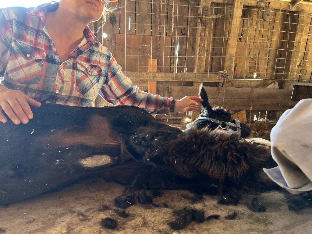 A week later we went out and finished the last five alpaca, our two new older alpaca were also a pain in the behind. They were used to being sheared but they were very scared during it. Padre is our biggest alpaca and he is twice the size of some of them. He was not very cooperative and he had to lift him up onto the table, it was at this point that Monica’s ability to deadlift really came in handy! Between the two of us we were able to force him up onto the table with people power (ie manhandle).