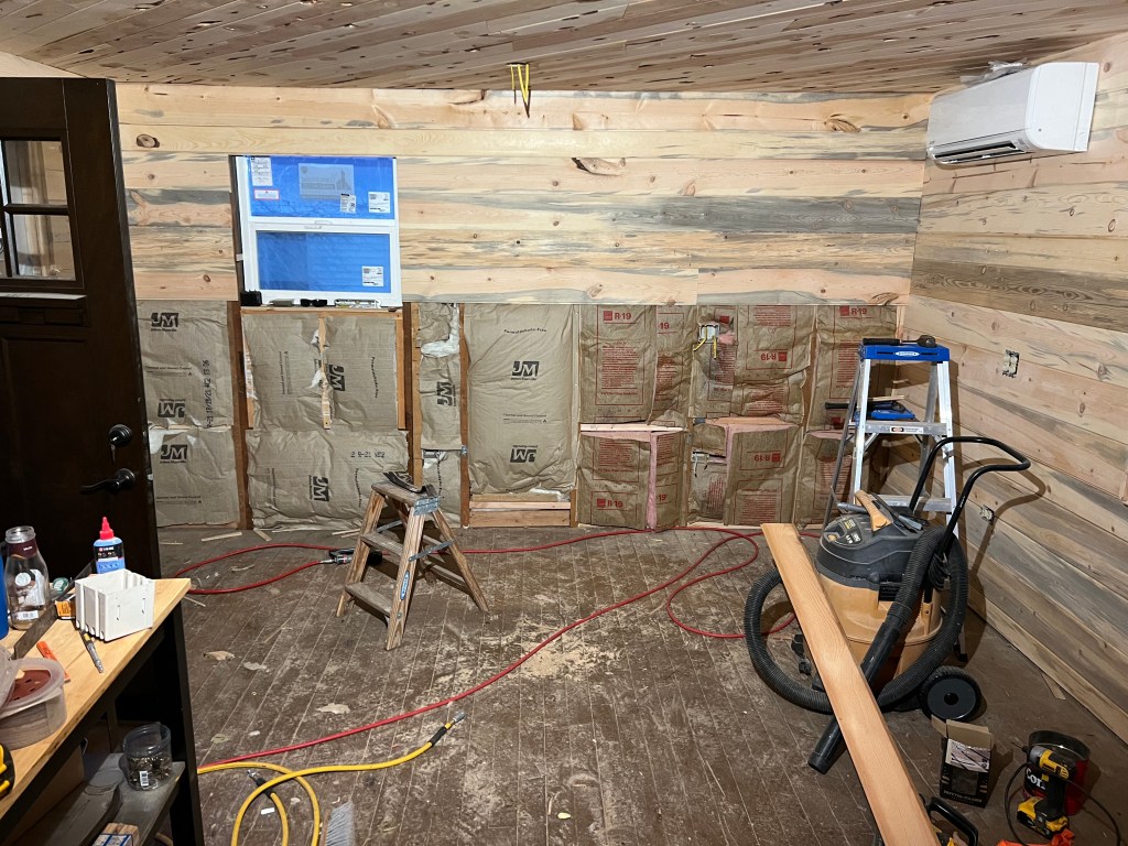 Well it was a productive week. I managed to get Mr Professional out on Sunday so we could work on the last wall. The tongue and groove is warped so it is near impossible to install alone as you cannot beat it into submission alone. The wall got sealed again around the window and the rest of the insulation installed around the window. While he did the insulation I crawled up into the attic and installed three junction boxes. I cut the power to the old junction box and then pulled those three lines up into the new attic boxes. I then pulled the feeder lines from the old box, reglued some new turns onto the pipe and rerouted the line to the new junction box. I only had the power off for about an hour. Once the new box was online I had to verify three times that the freezers really had power! That was my greatest fear with switching out the main boxes. I was even able to use a spare piece of the main feeder line to connect both grounding strips together.