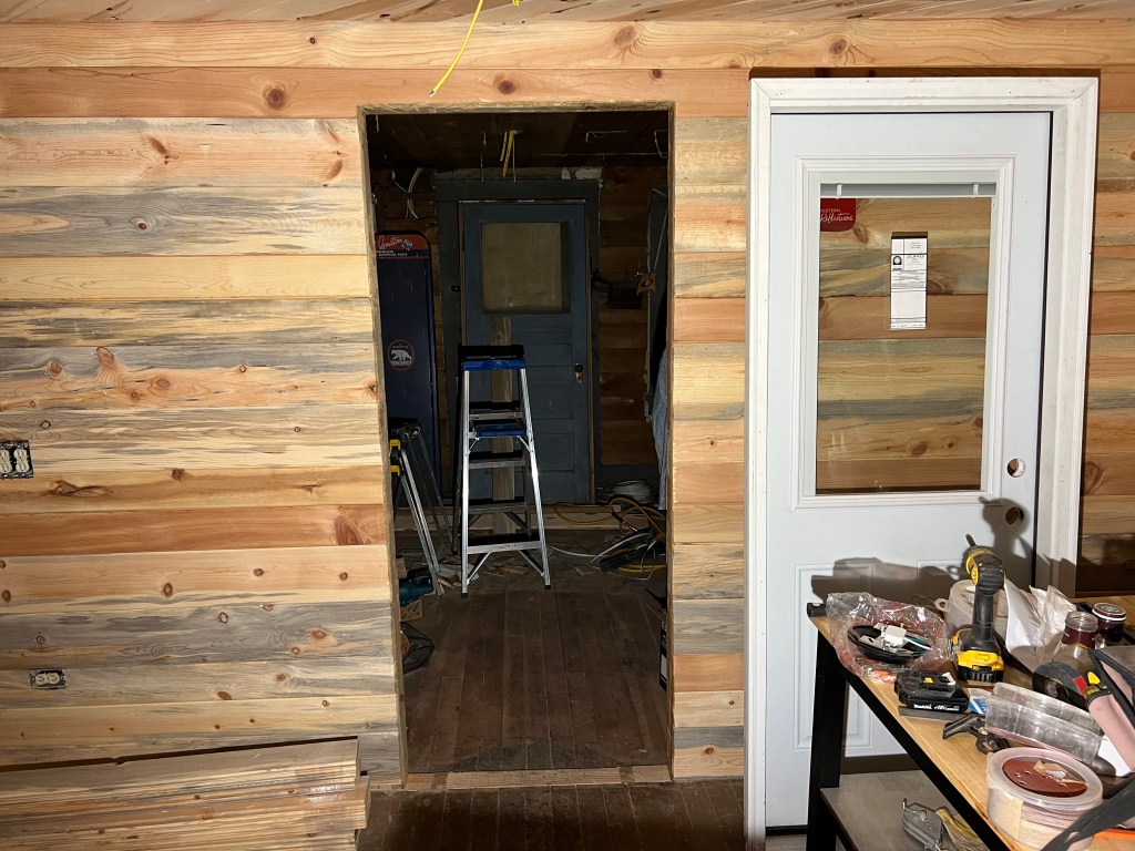 I only have 48-52” pieces of wall tongue and groove left. I have enough pieces I was sure I could just slap them up and get it done. I failed to account for the fact that every new piece needs to be on a vertical stud. This means cutting every board at least twice if not three times. Mind you at least I can get the boards installed, they are short enough to handle alone but to get the edges correct I have to install the entire row and then go back and nail it in place. It was a lot more cutting and tape measure work and remeasuring and recutting than I expected and I failed to get the wall completed in the five hours I allotted to completing the wall. I now only have 20” of vertical height left but I have to still do cutouts for two outlets. I contemplated finishing the wall on Sunday but the heater is now installed and the interior door really needs to be installed to help trap the heat in the office.