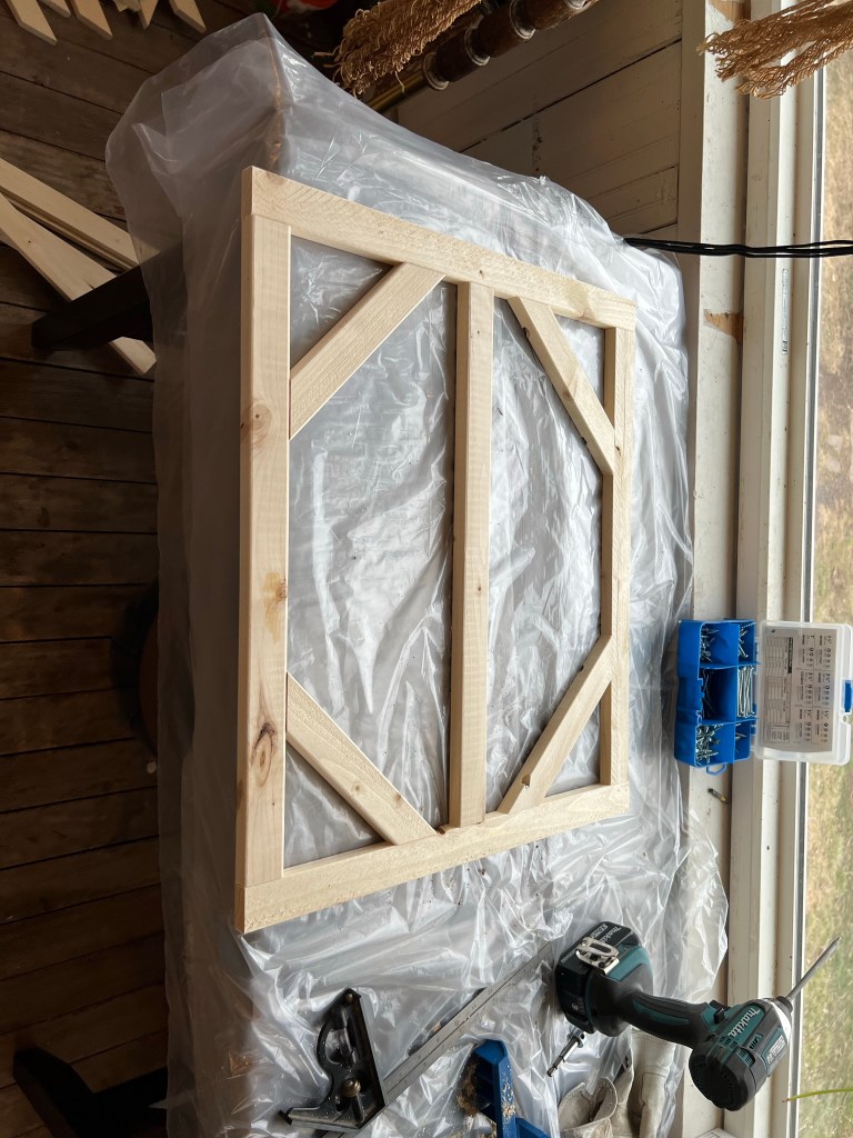 I had to go in and pickup some lumber for the barn doors in the office so I grabbed enough to do the frames for the bathroom closet. I did one frame out of 1×4” boards but Annmarie thought it was too heavy. It is solid, no doubt about that. So I picked up a bunch of 1×2” boards to make new frames. I was not sure if my Kreg tool would do this thin of wood but I had no trouble drilling angled holes and assembling the frame with screws. I had to install three pieces on the front of the doors to attach magnets. Once I get all of the frames built I will need to cover up the outer edges of the closet with blue tape and then clamp each frame in place and drill a small hole through the frame and into the closet opening. This will mark my spot to drill the sink holes for the magnets that need to be installed on each side. The blue tape will help protect the wood and let me draw on the frame to mark their proper location.