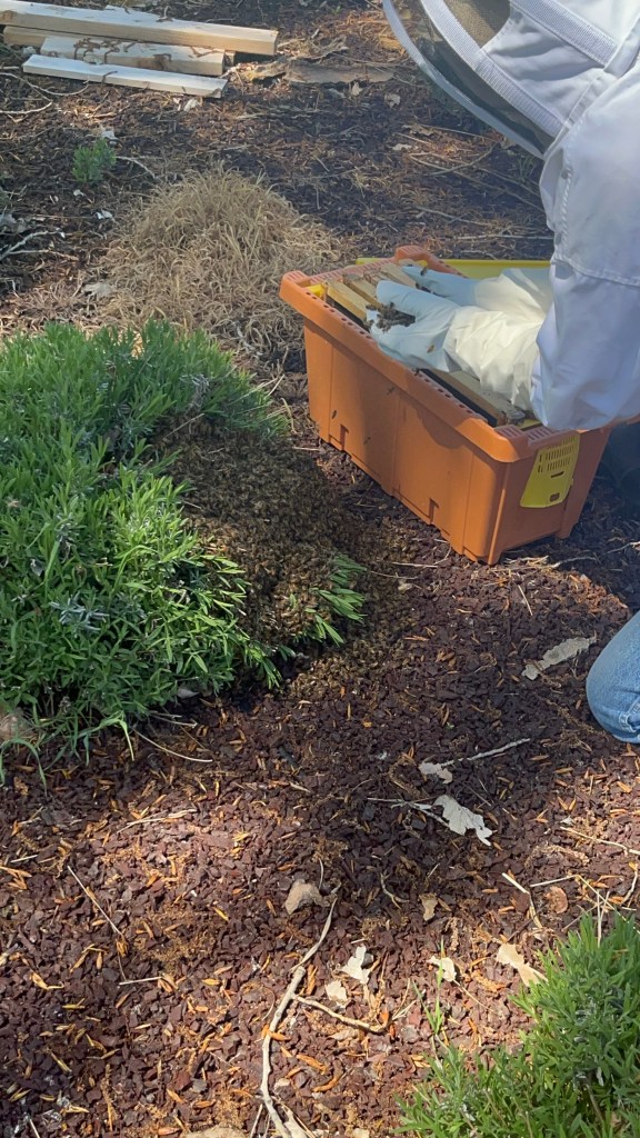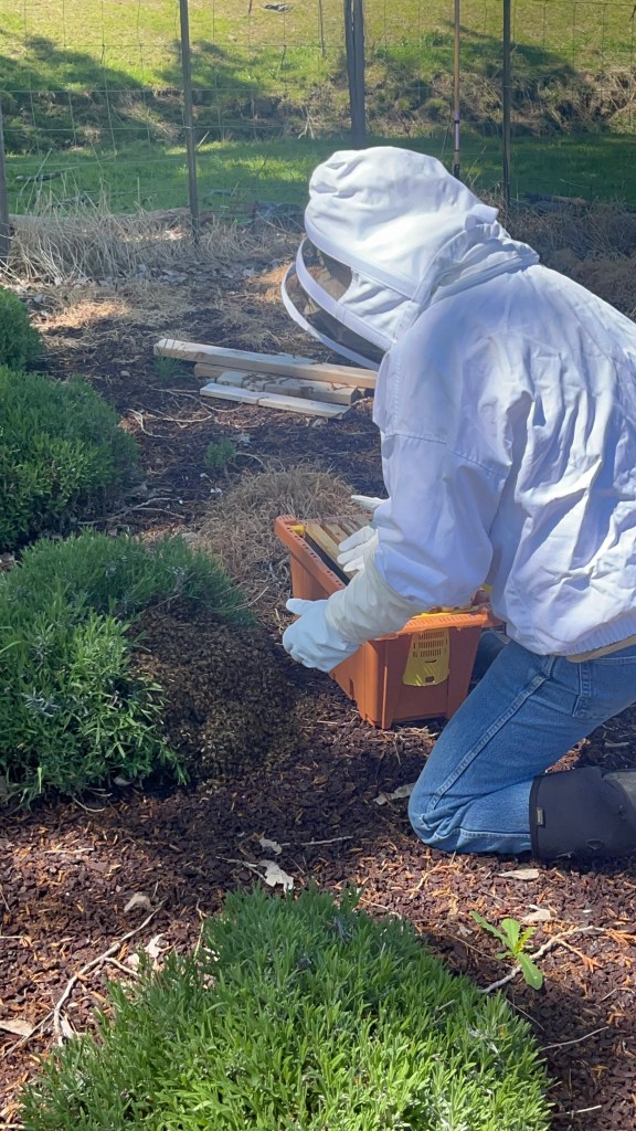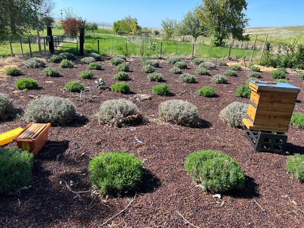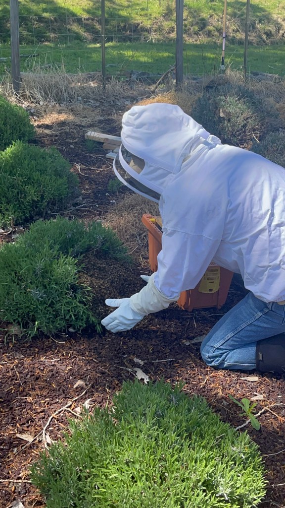 The next morning she went out, closed off the hive and moved it to the new area we set up out in the orchard. Eventually, we will get the hive from the lavender patch moved out into the orchard, but it is full of bees and heavy so it needs to be moved as an entire unit early in the morning when its cool.